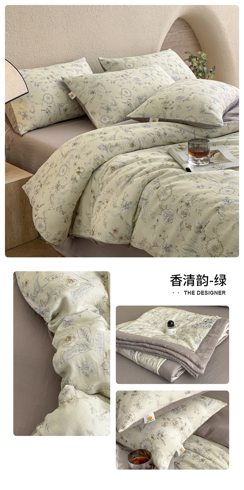 商品名称:慕晨 2025新款全棉双层纱四件套莱赛尔夏被莱赛尔夏被四件套天丝夏凉被直播 香清韵-绿