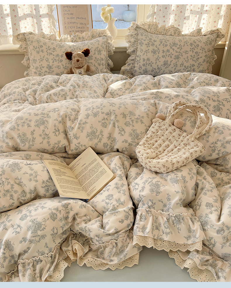 商品名称:轻奢坊 2025新款双层纱双层蕾丝花边四件套 蓝结