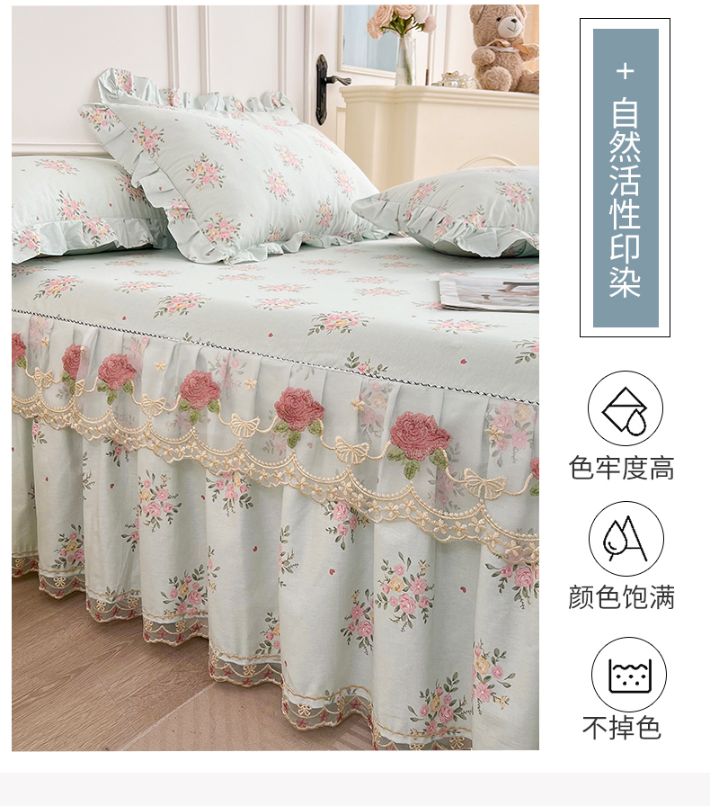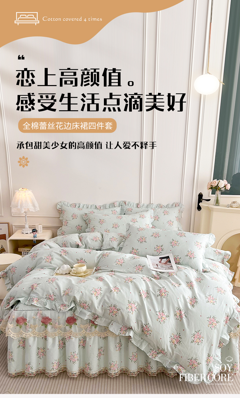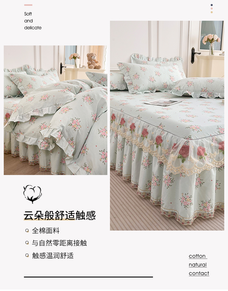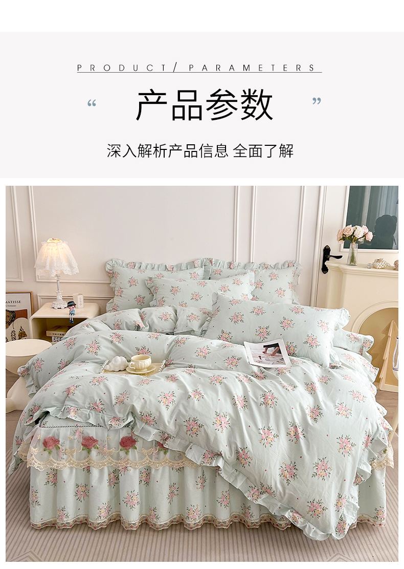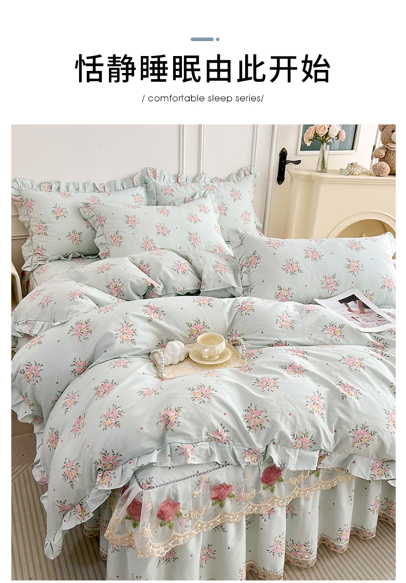 当前位置: 91家纺网 > 商品网购 > 床品套件 > 四件套 > 全棉普通四件套 > 十个点 2025新款全棉纯棉蕾丝花边床裙四件套 嫣语-兰