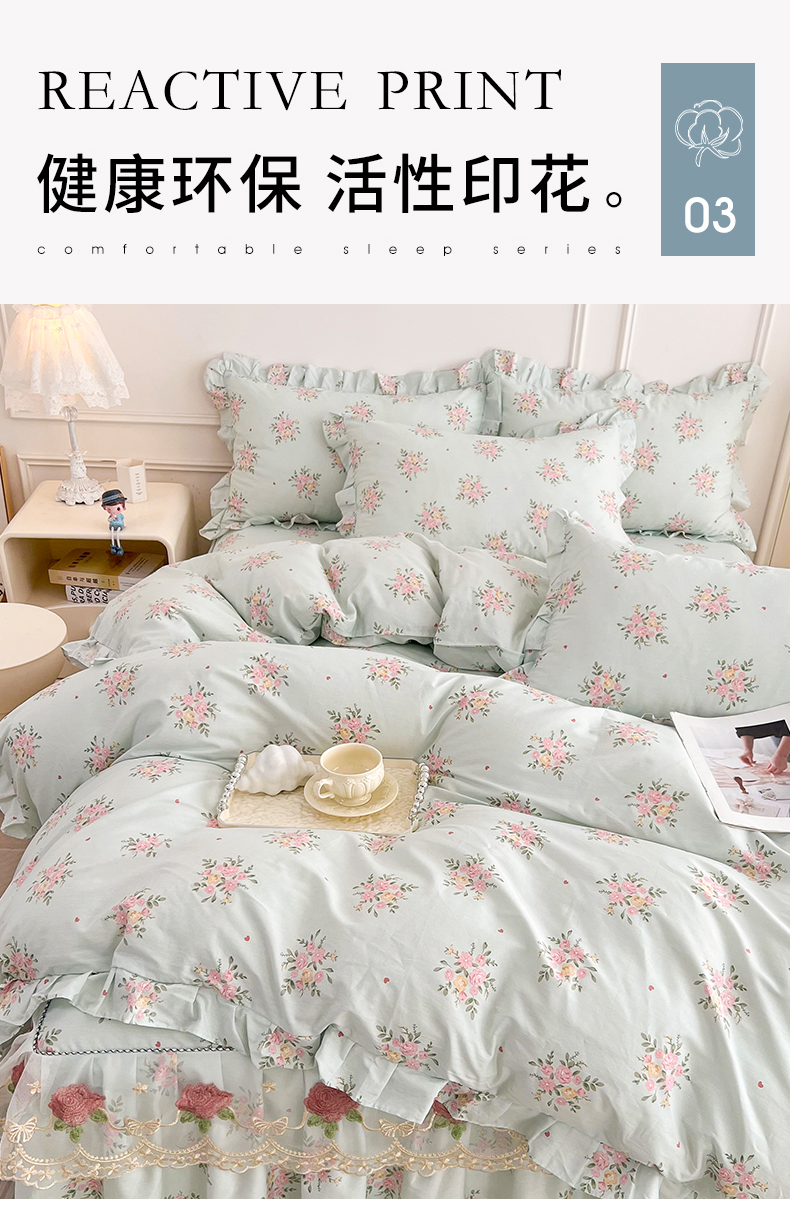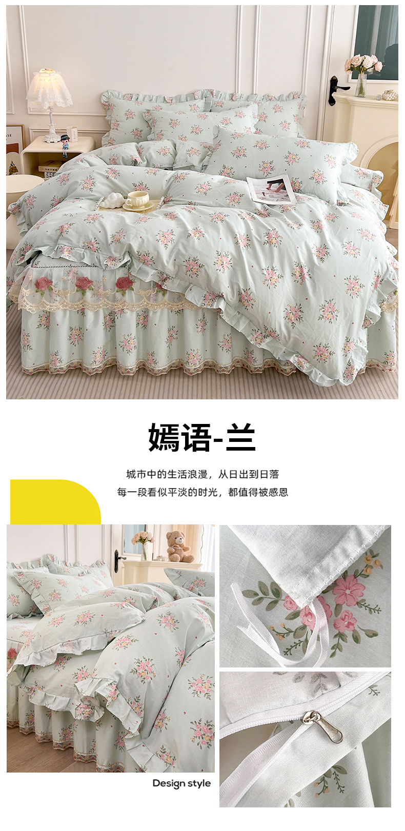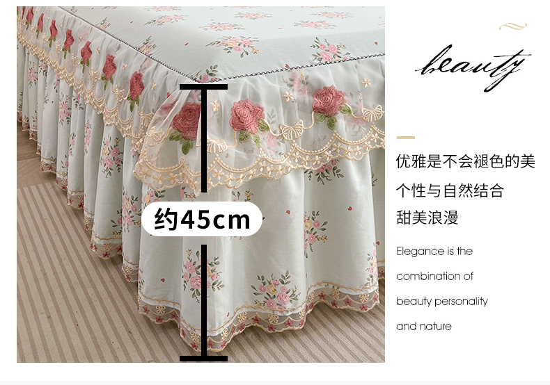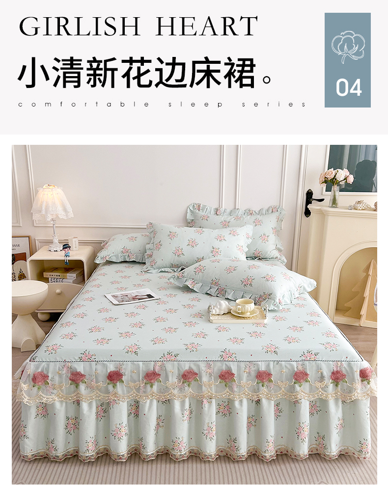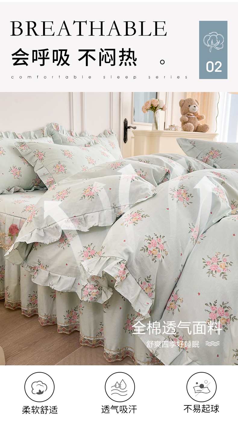当前位置: 91家纺网 > 商品网购 > 床品套件 > 四件套 > 全棉普通四件套 > 十个点 2025新款全棉纯棉蕾丝花边床裙四件套 嫣语-兰
