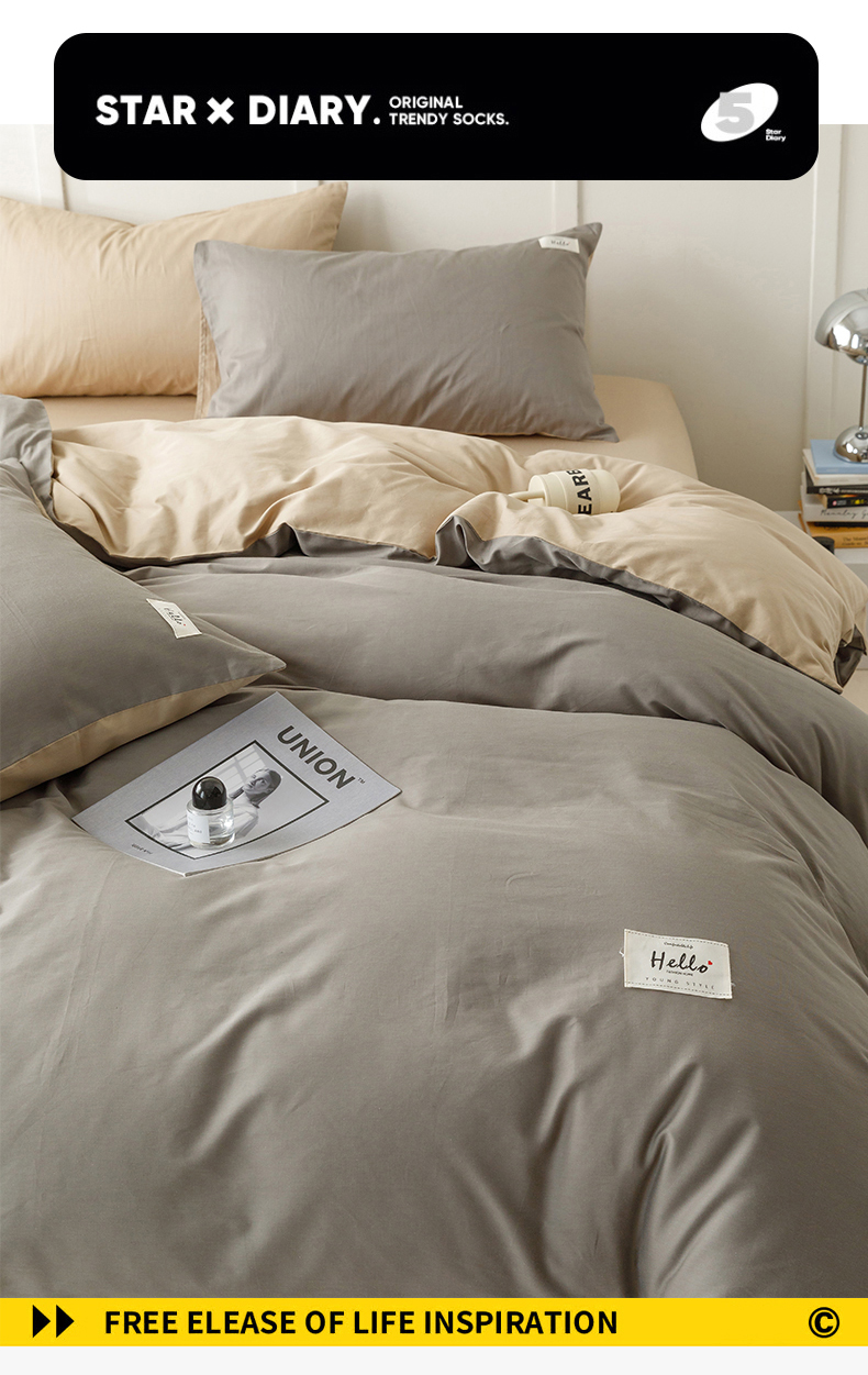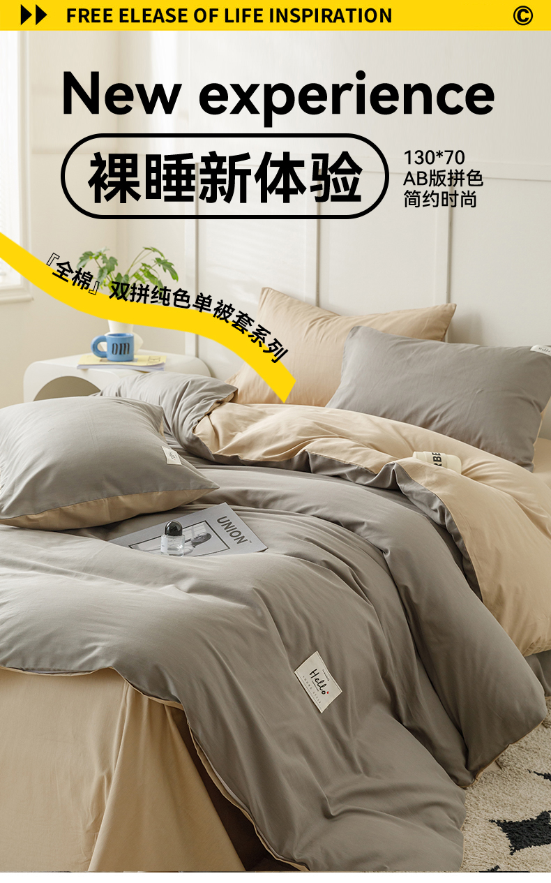 798家纺 2026新款全棉13070纯色双拼系列单被套场景一 浅灰+卡其
