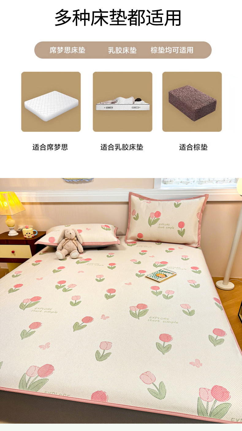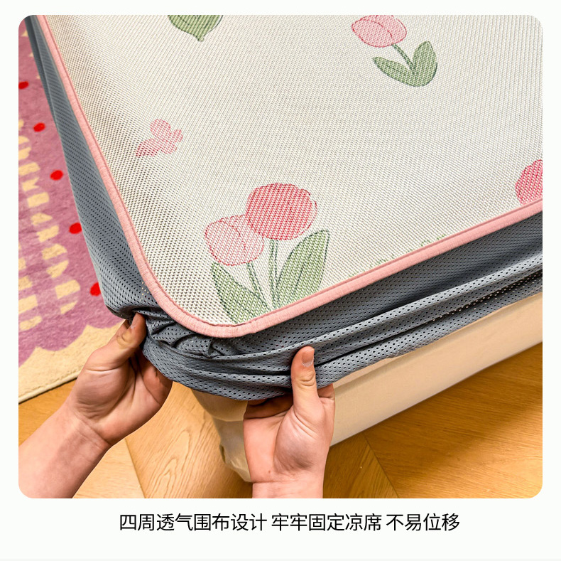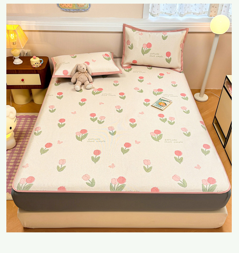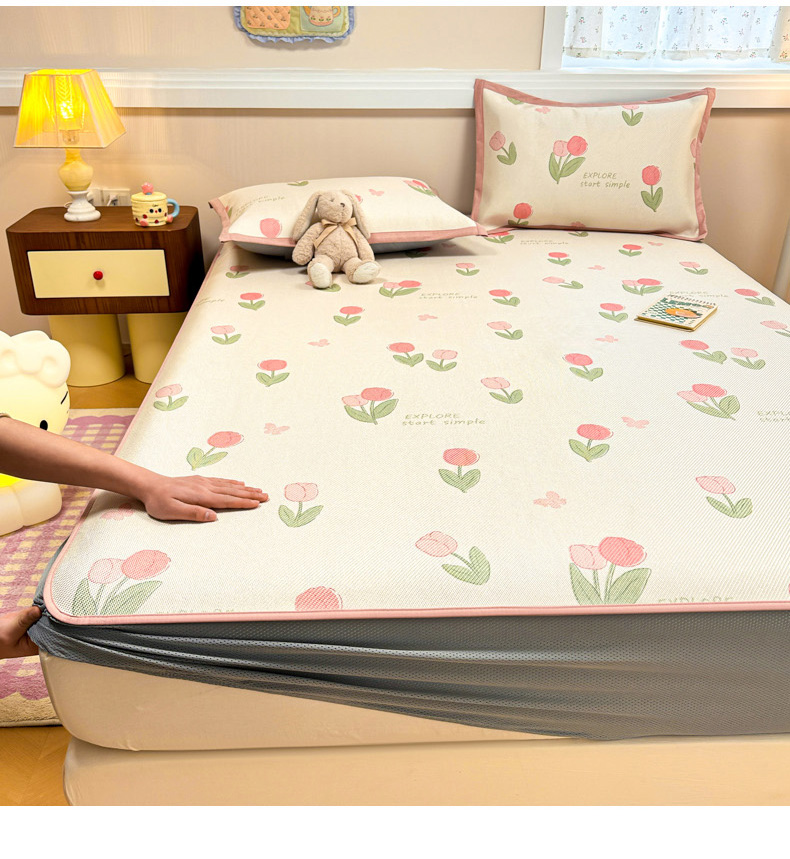 沐慕 2025新款高克重600D冰丝印花冰藤床笠 床笠-粉嫩郁金香