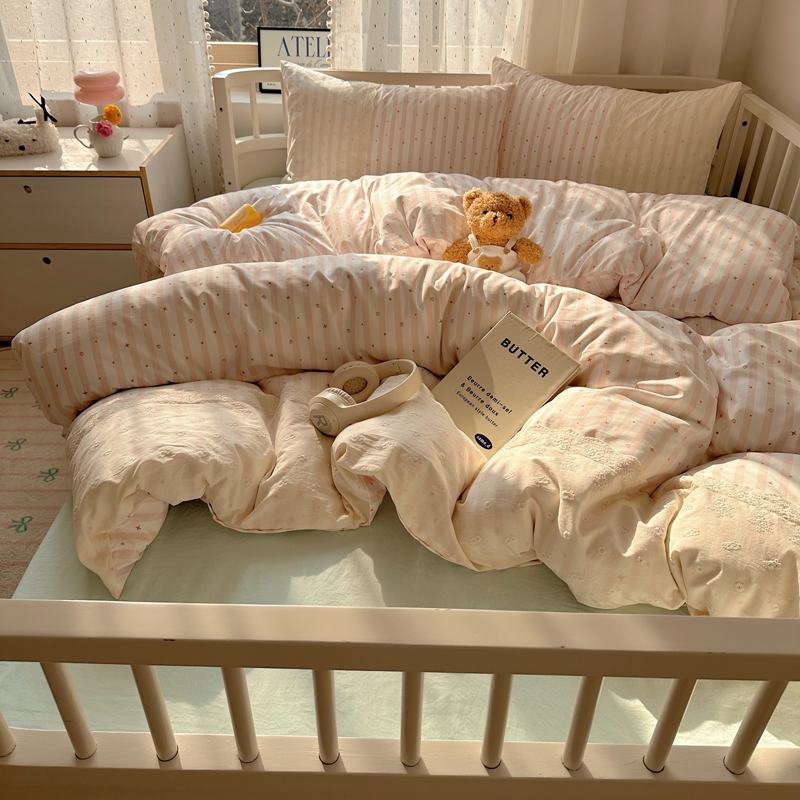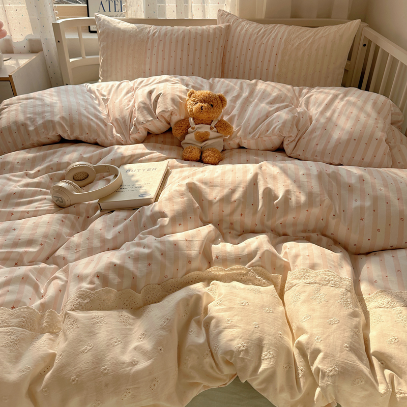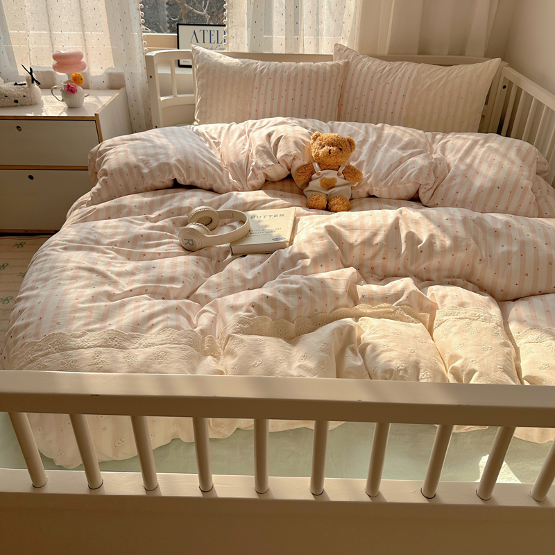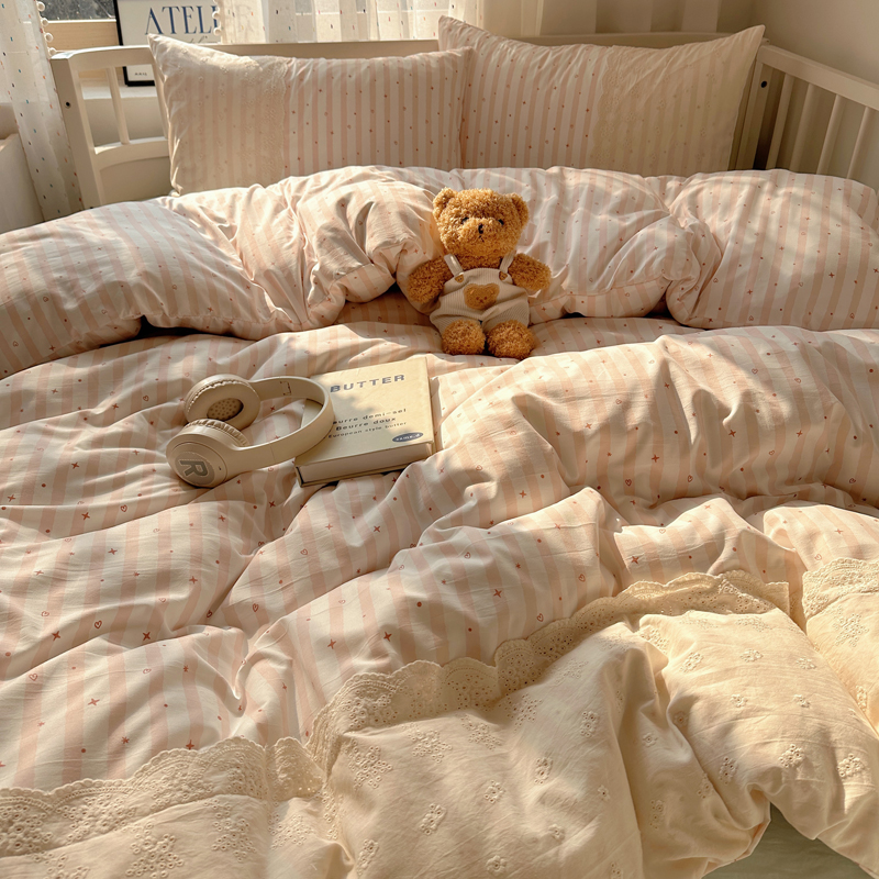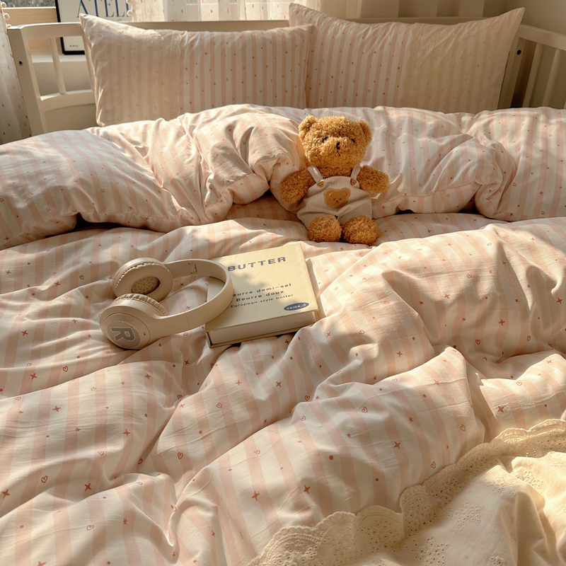 商品名称:顾里家纺 2025新款简约小资系列云感双层纱四件套 条纹星星粉