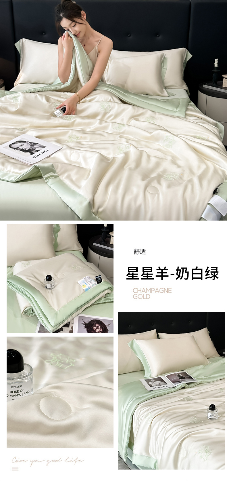 • 91家纺网 家纺一手货源 找家纺 满羽家纺 2025新款冰丝夏被四件套-满绣系列 星星羊-奶白绿