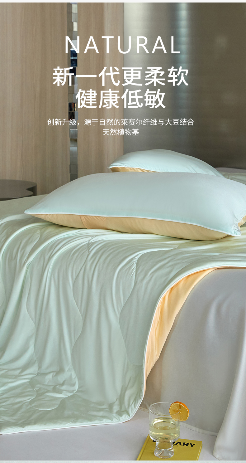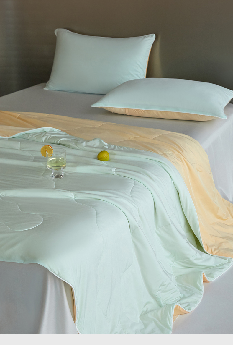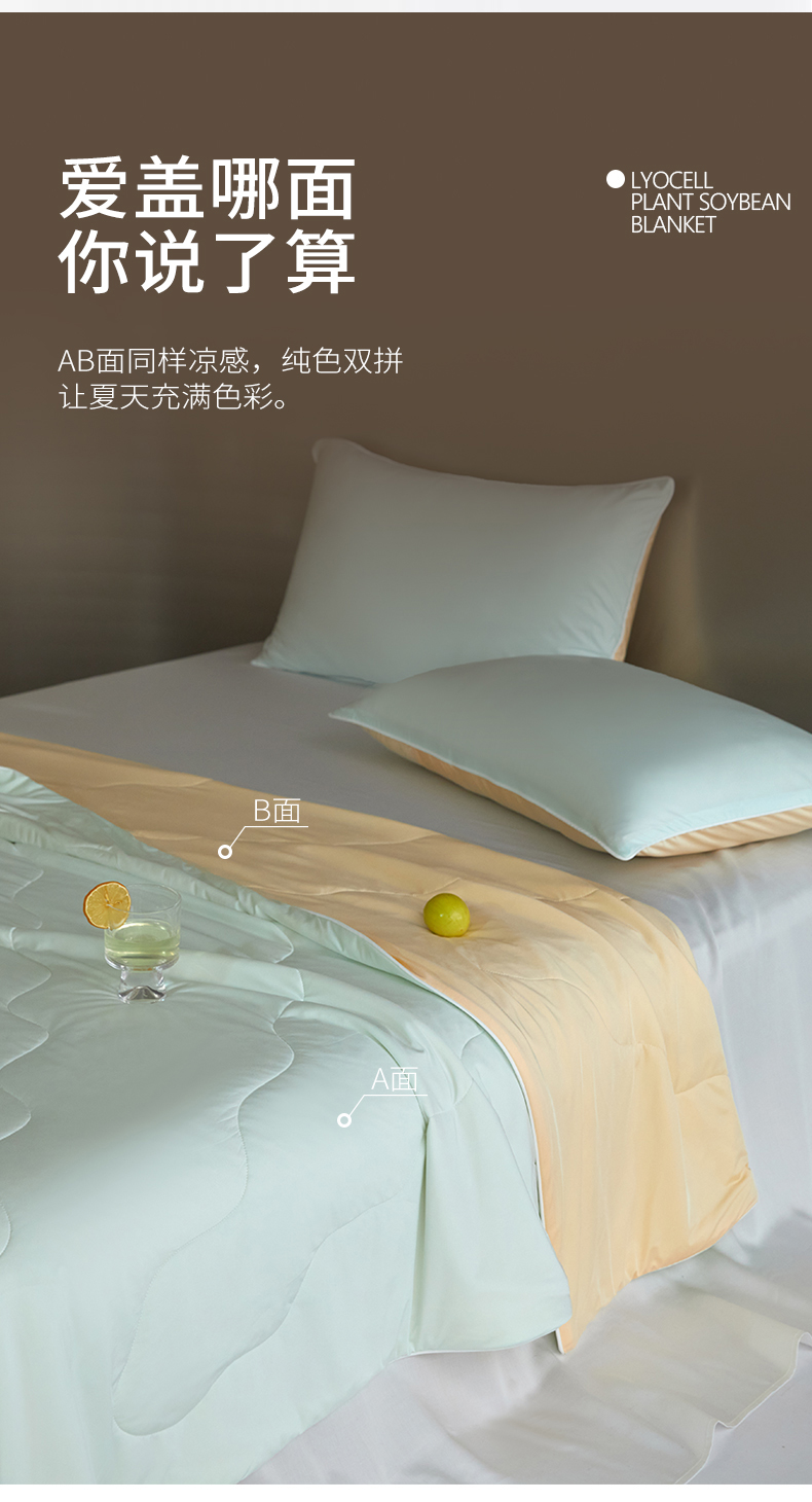 被子 > 夏被 > 头等舱 2025新款锦氨(165克)水光亮面锦A类55莱赛尔植物大豆7A抗菌夏凉被夏被-配礼盒(空镜图) 天青色+暖黄