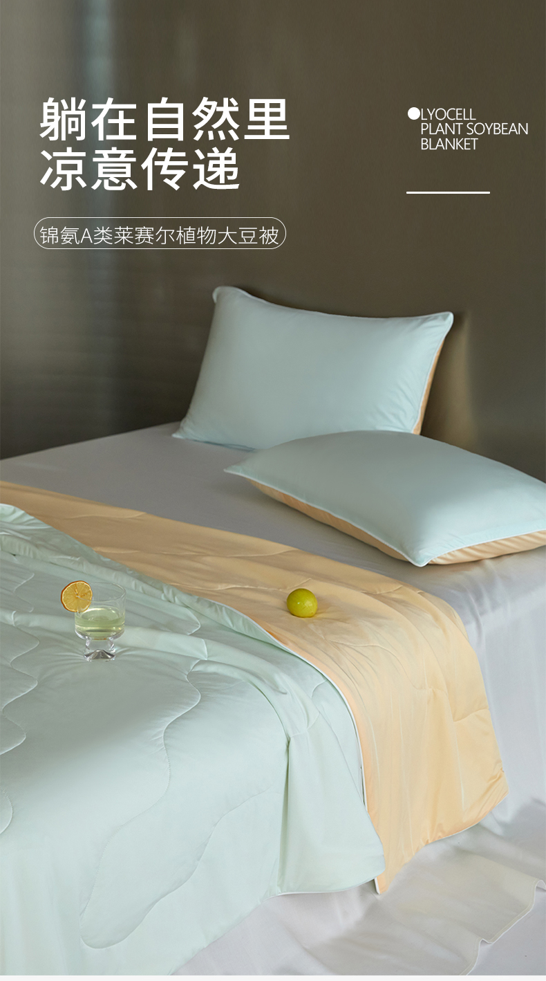 商品名称:头等舱 2025新款锦氨(165克)水光亮面锦A类55莱赛尔植物大豆7A抗菌夏凉被夏被-配礼盒(空镜图) 天青色+暖黄