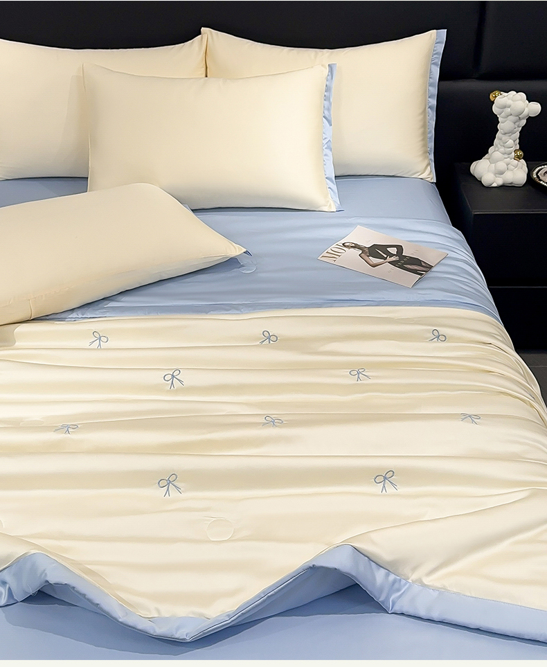 2025新款清凉舒适水洗冰丝刺绣夏被四件套 蝴蝶结-奶白蓝