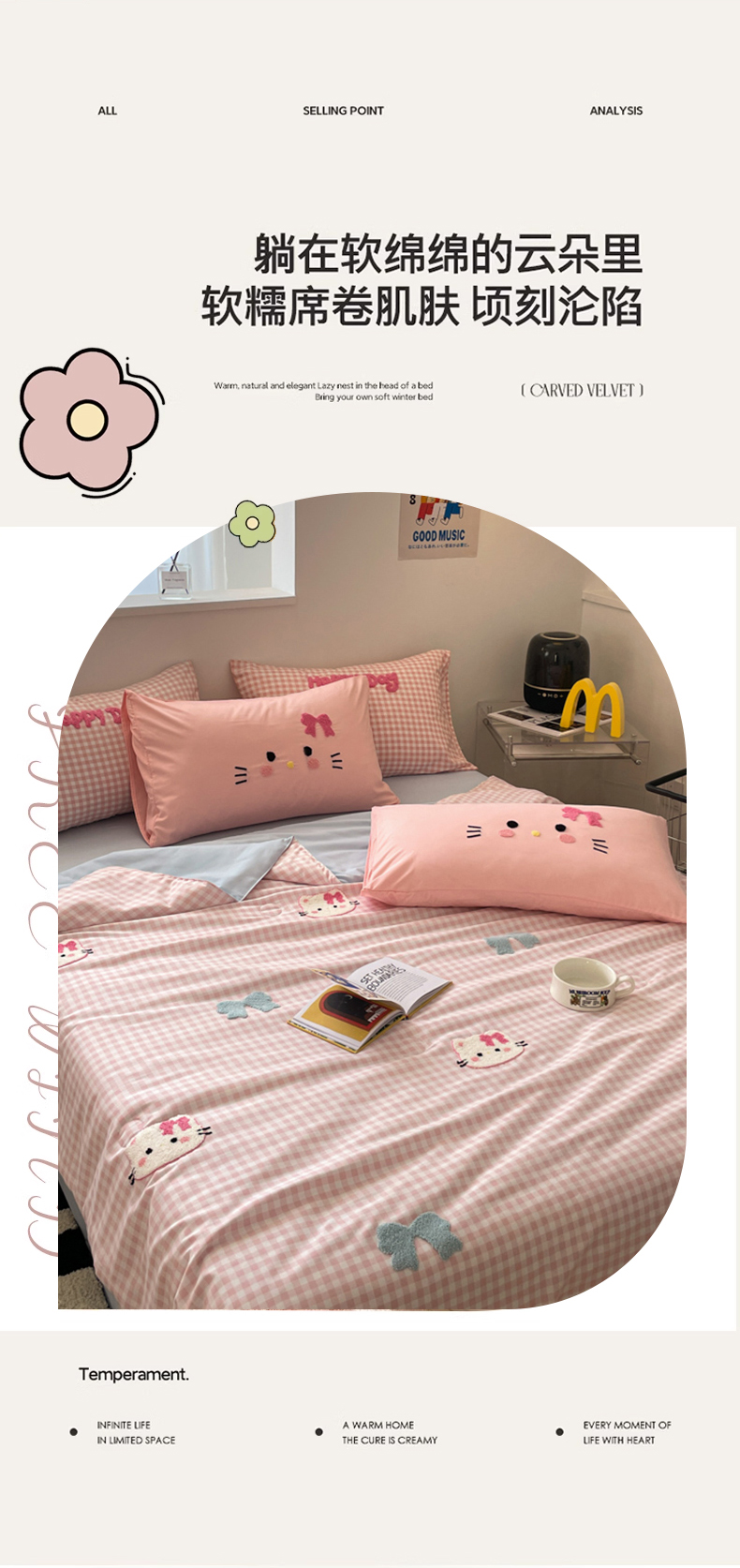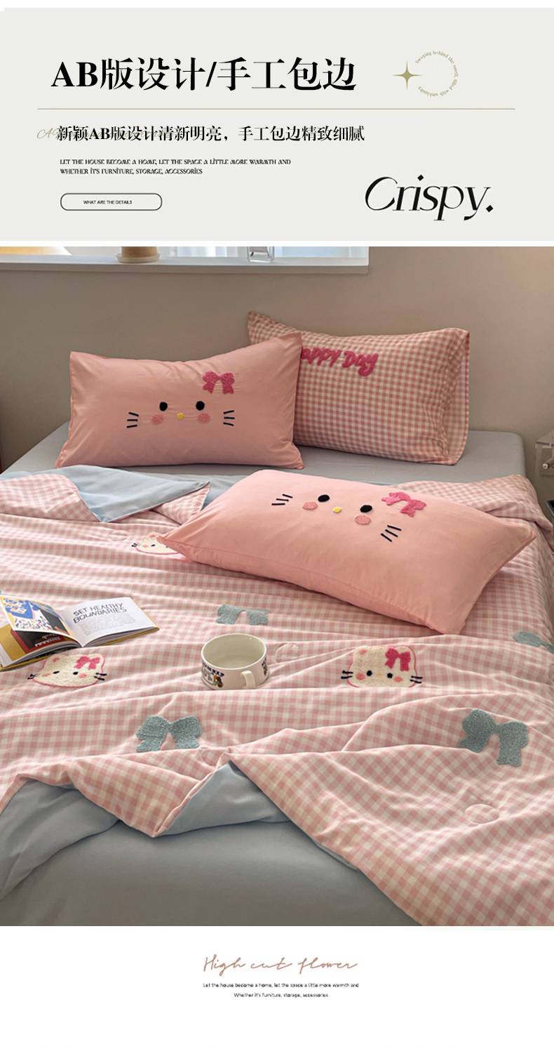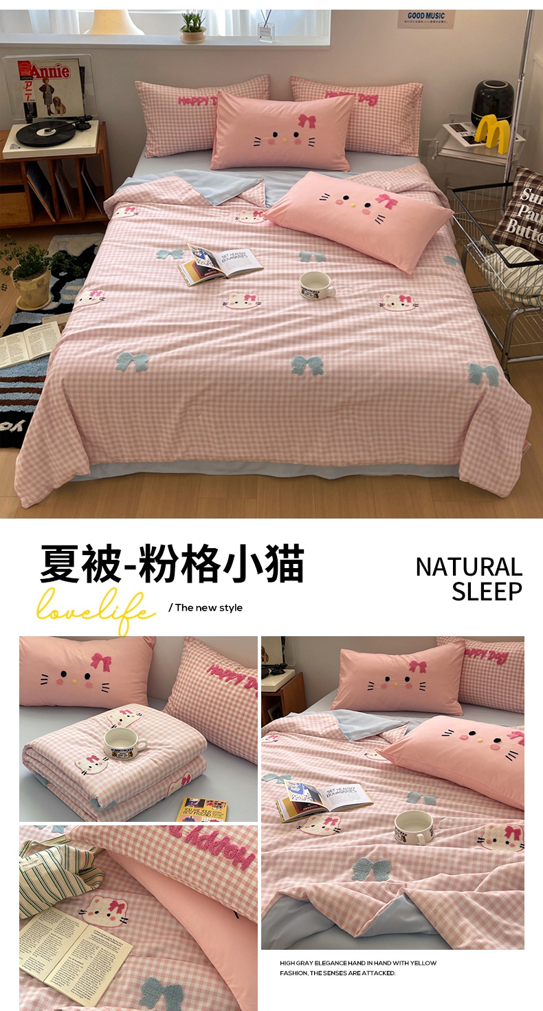 • 91家纺网 家纺一手货源 找家纺 红嘴企鹅 2025新款卡通毛巾绣空调被夏被四件套 夏被-粉格小猫