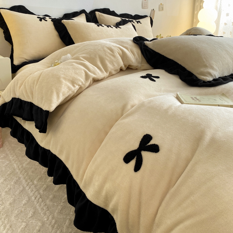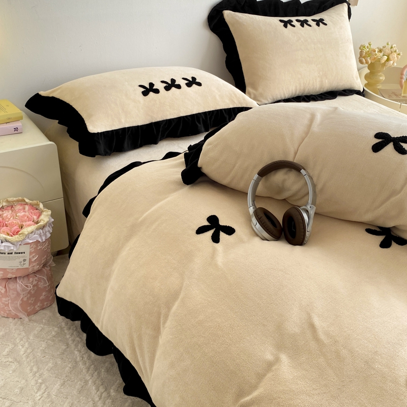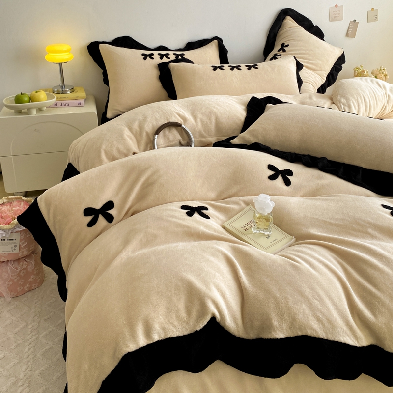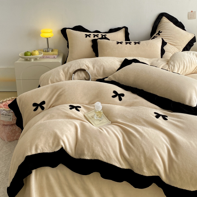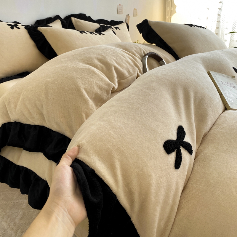 商品名称:梦莱斯2025新款黑边绣花牛奶绒四件套 蝴蝶结-咖
