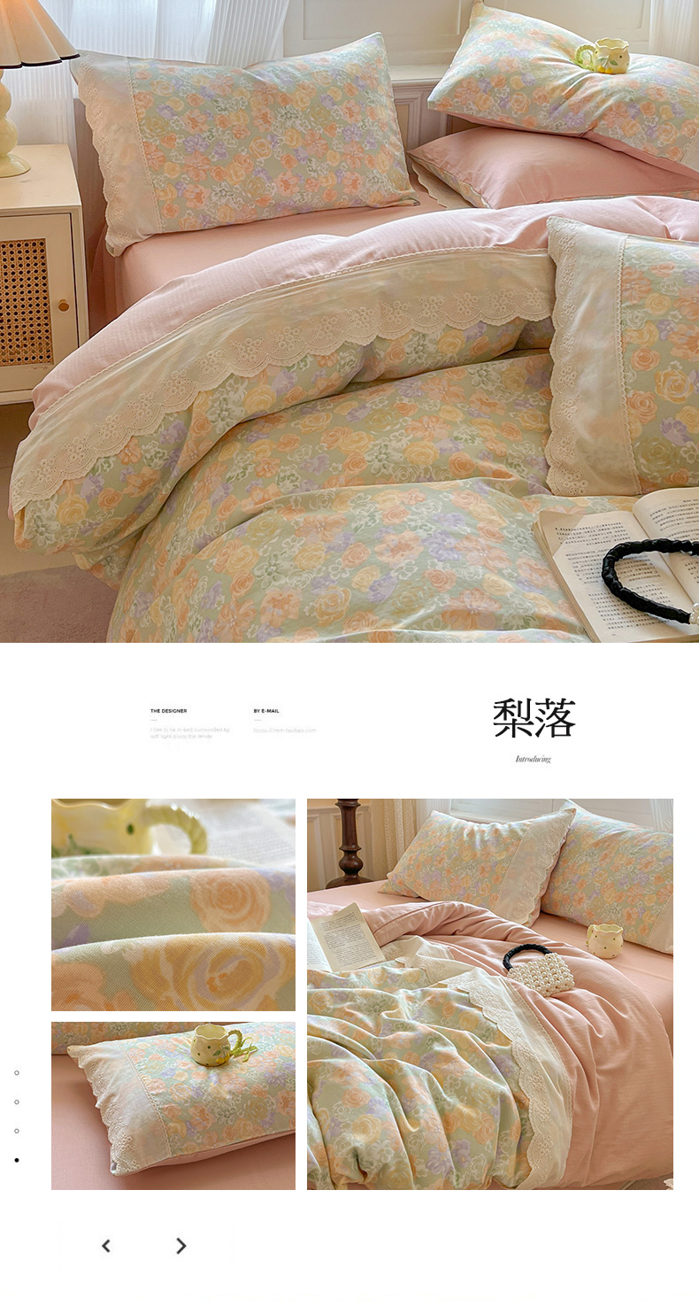 商品名称:首尔2025新款全棉双层纱小碎花花边款四件套 梨落