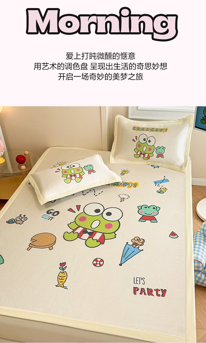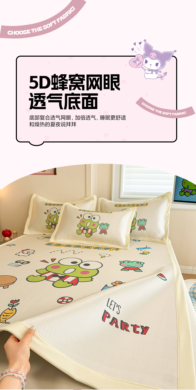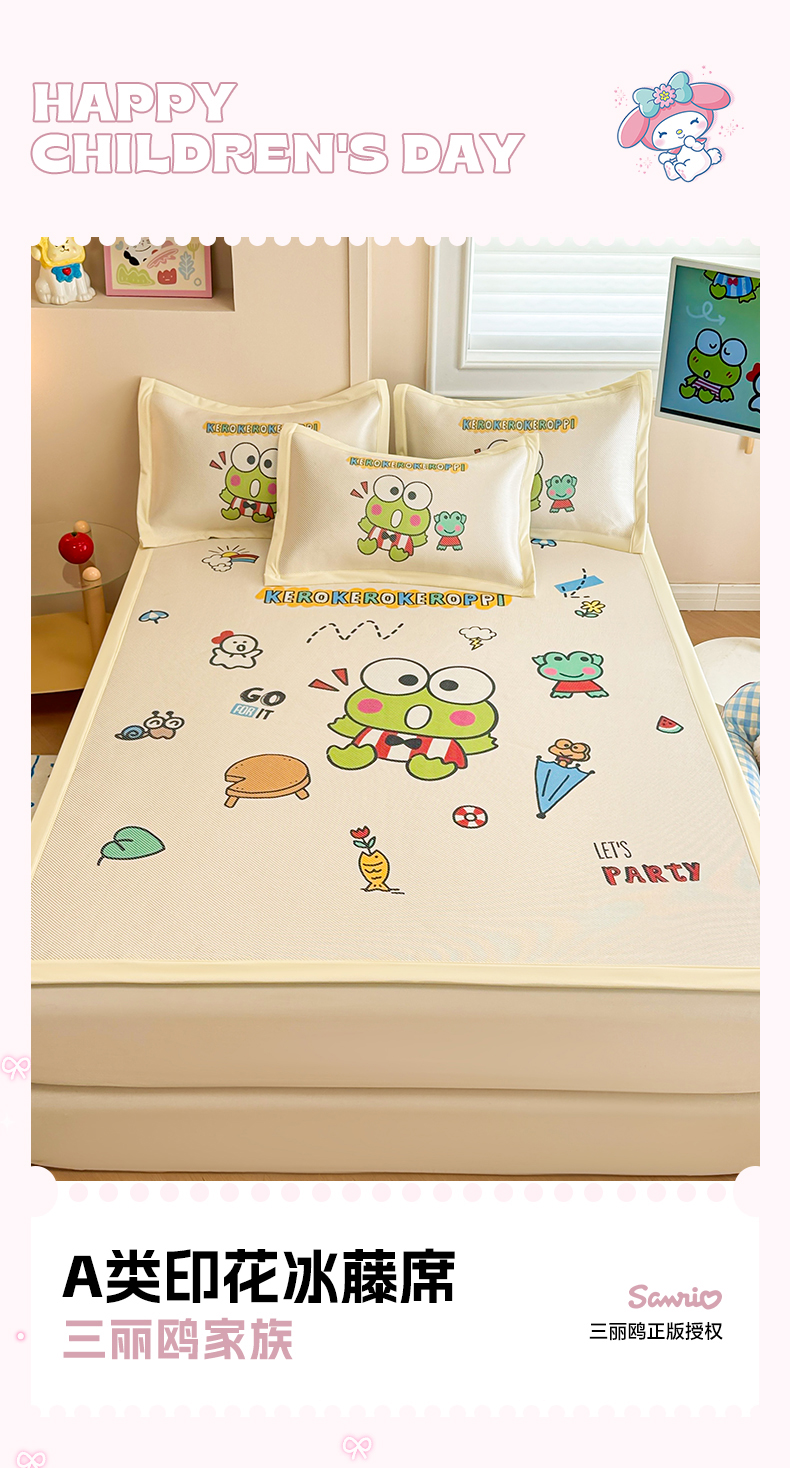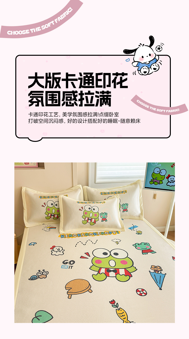 商品名称:蓝邻 2025春夏新款正版三丽鸥600D冰藤大版数码印花凉席-场景一 派队三眼蛙