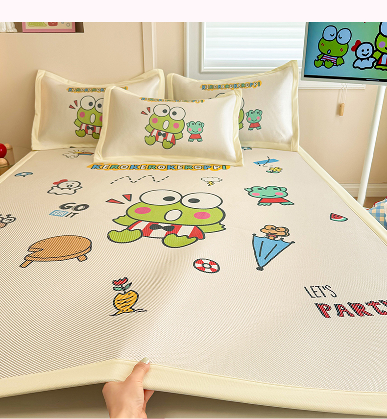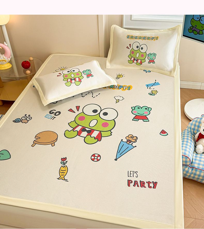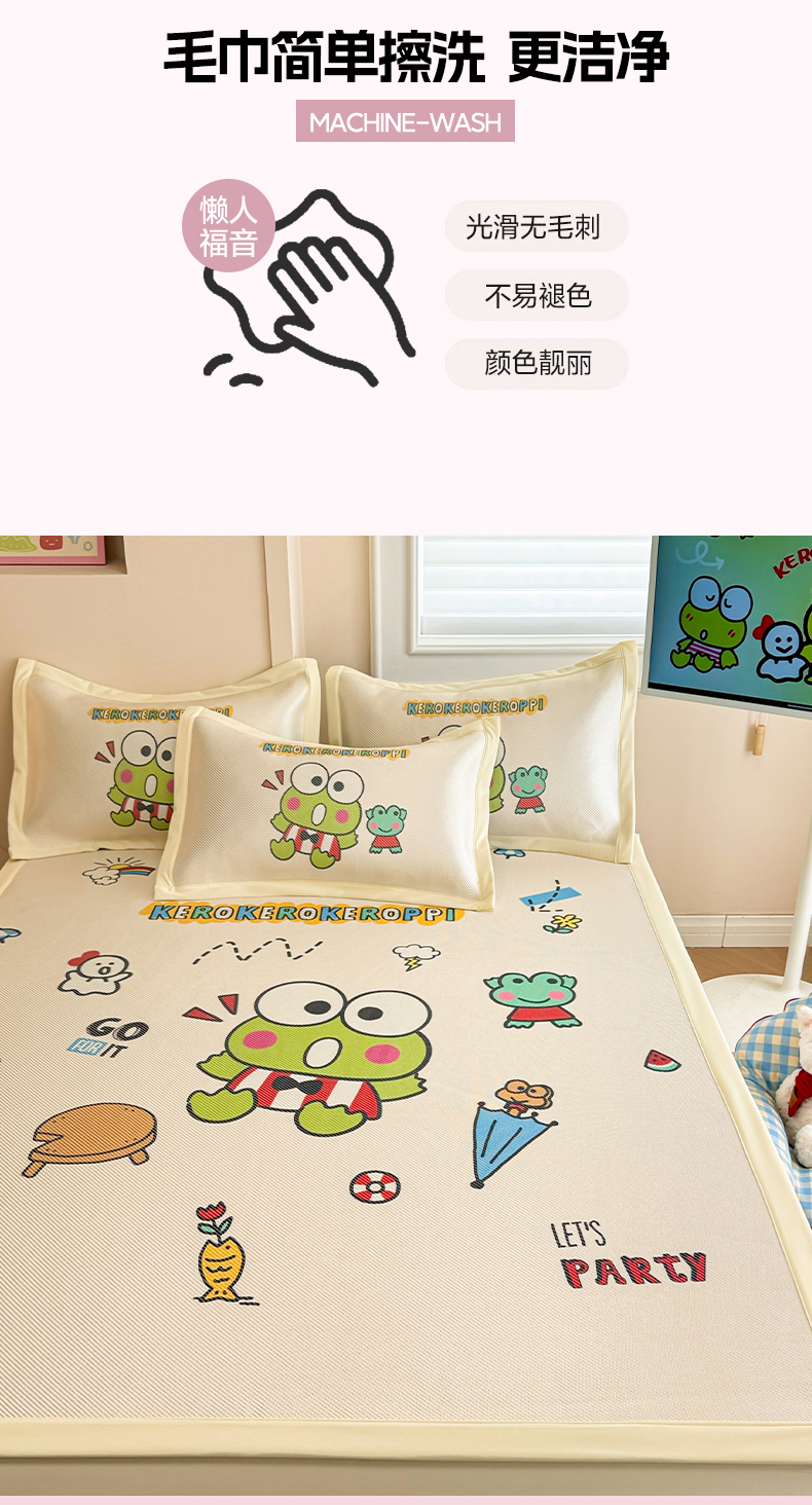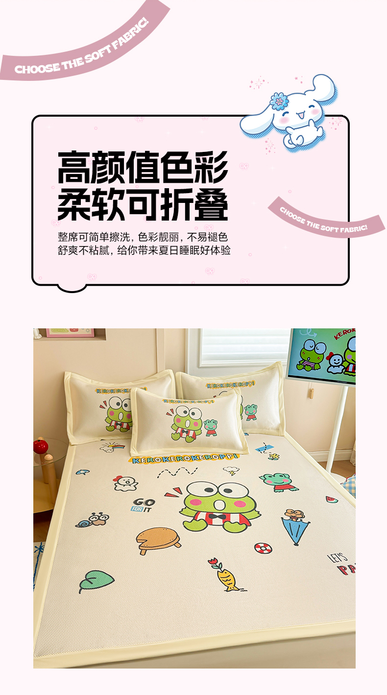 商品名称:蓝邻 2025春夏新款正版三丽鸥600D冰藤大版数码印花凉席-场景一 派队三眼蛙