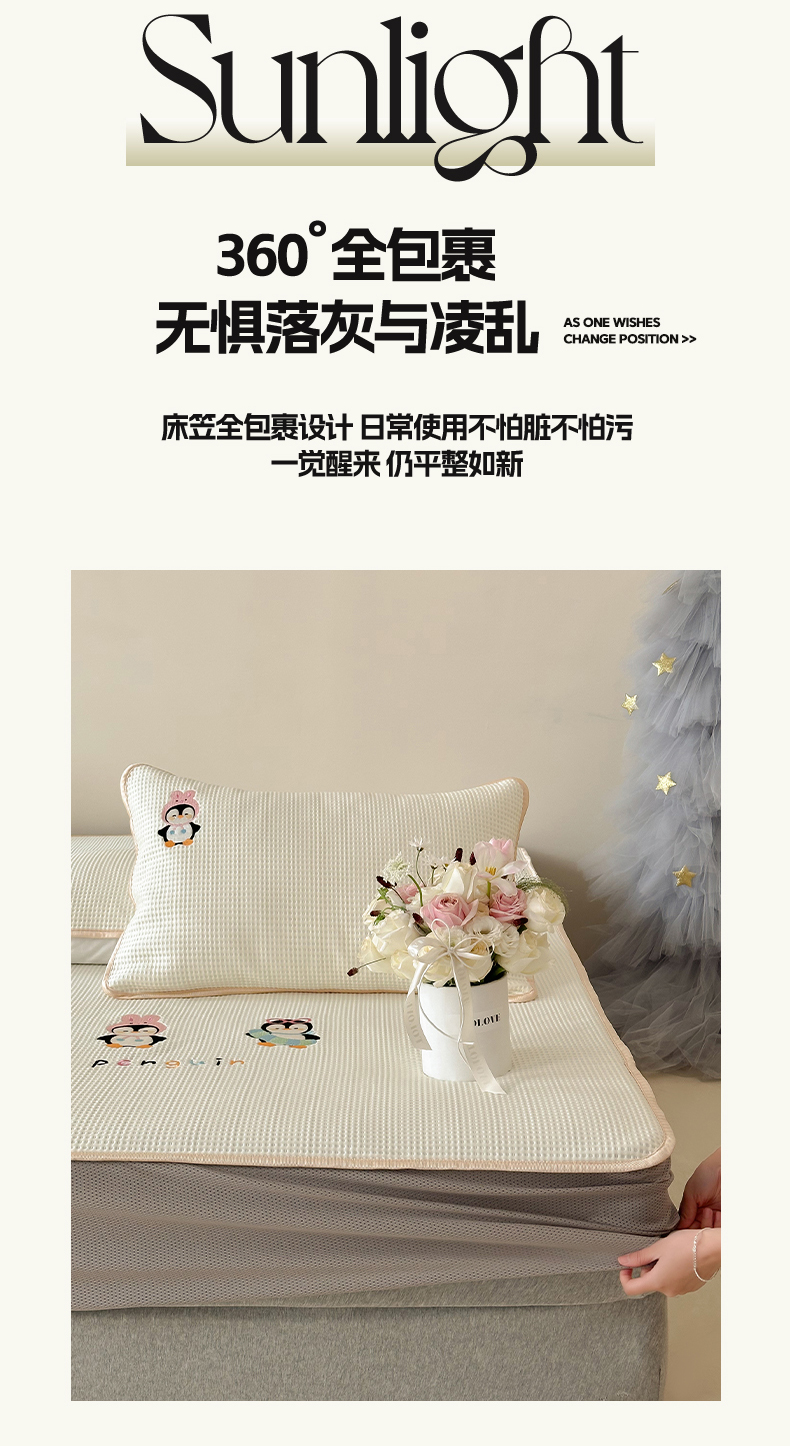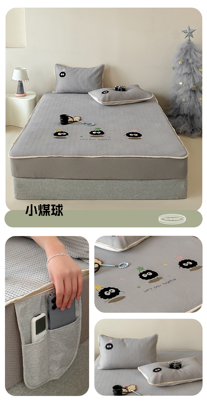 圆岛家纺 2025夏季高分子PE华夫格刺绣软凉席床笠款三件套 小煤球