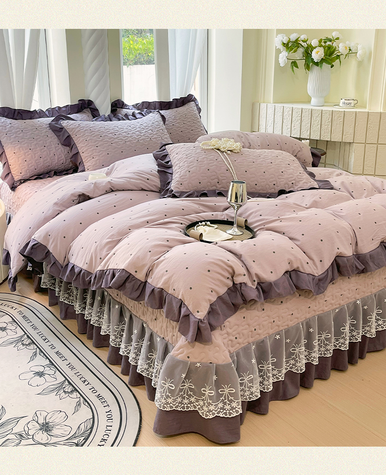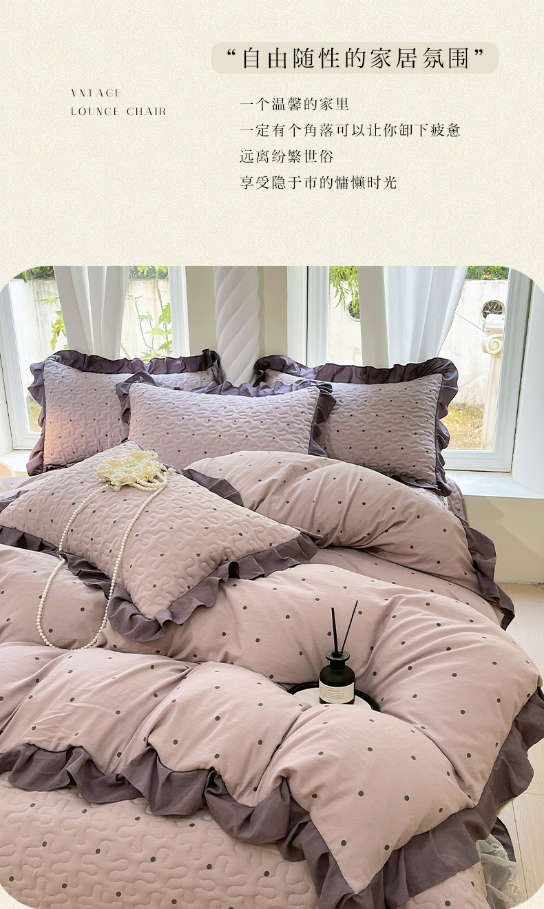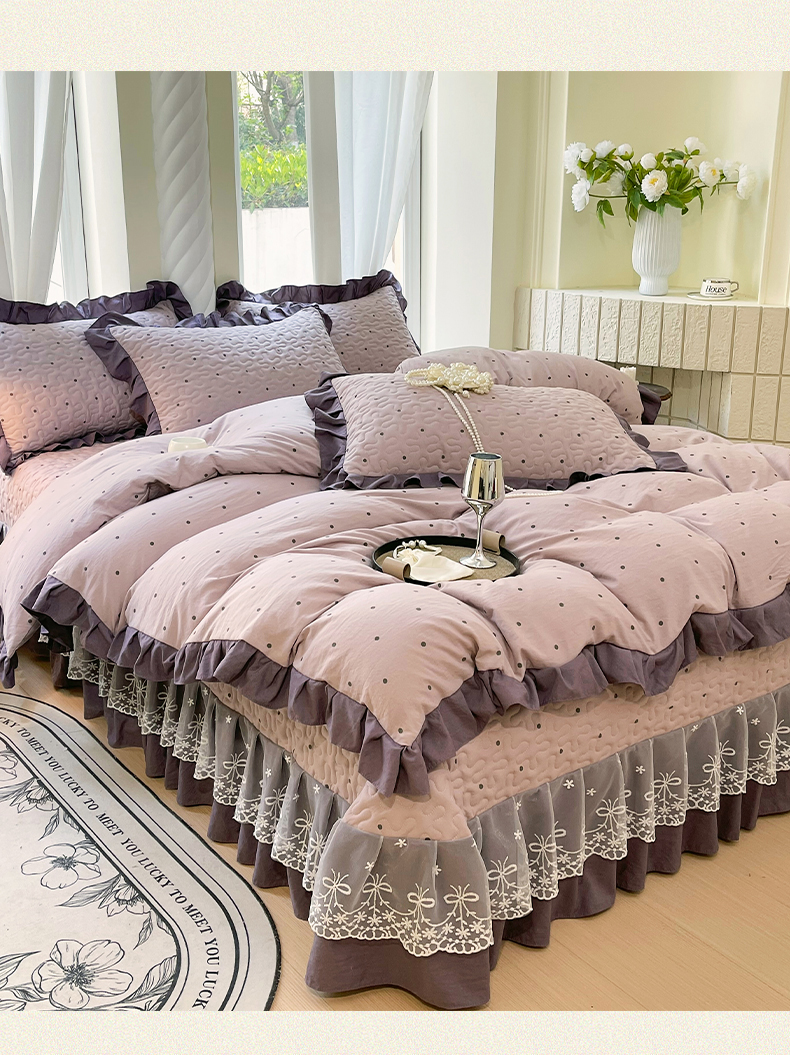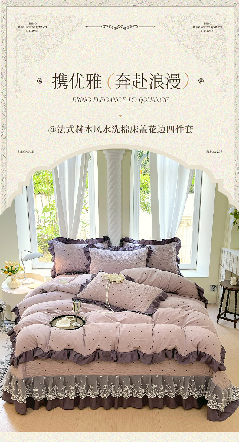 当前位置: 91家纺网 > 商品网购 > 床品套件 > 四件套 > 水洗棉四件套 > 雨彤家纺 2025年新款赫本风云朵水洗棉夹棉双层花边床盖四件套 芋艿波波-紫-赫本风