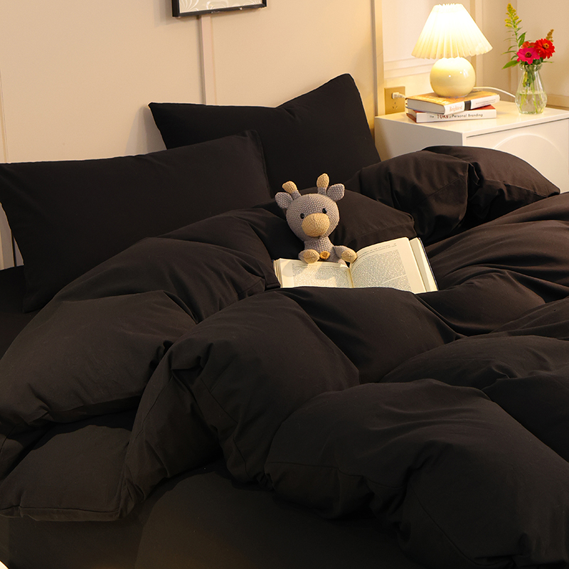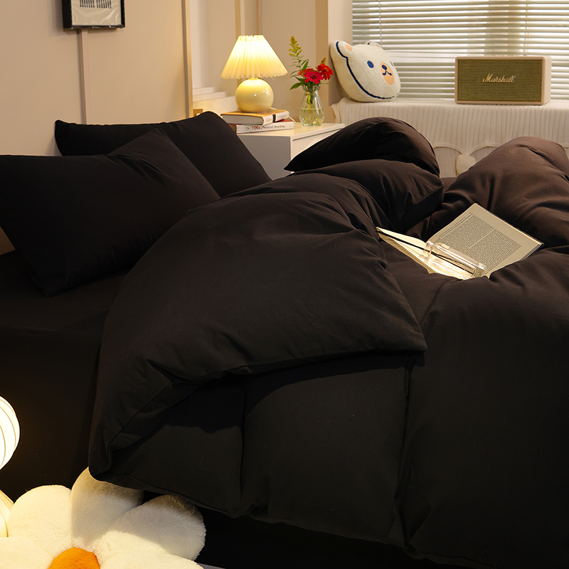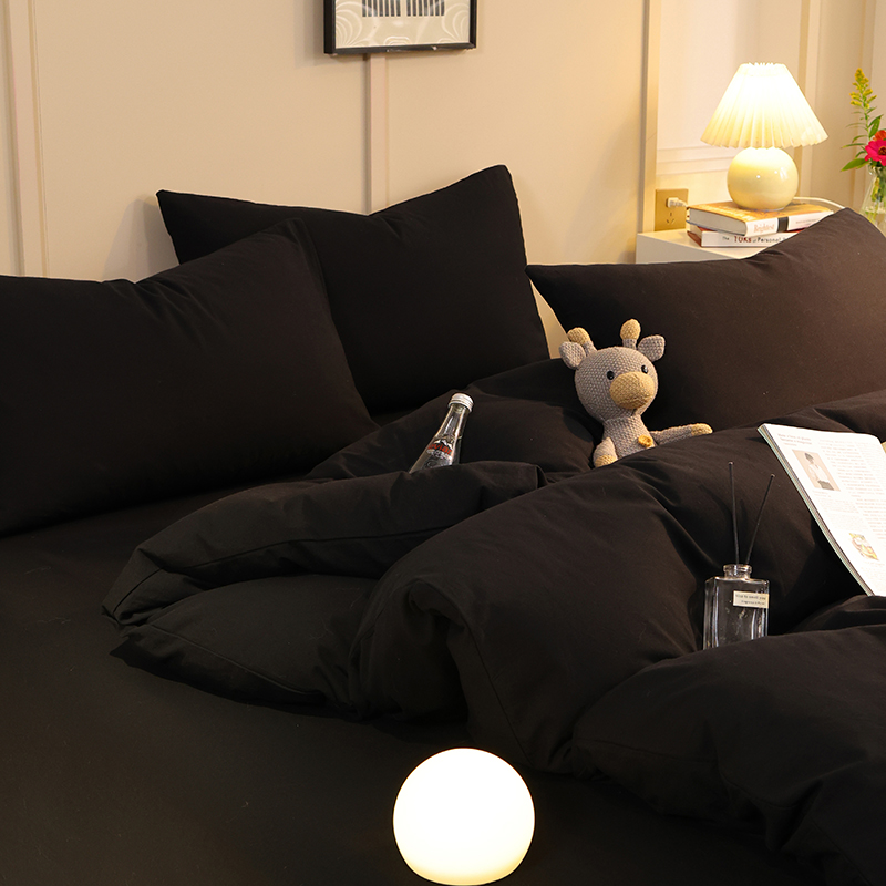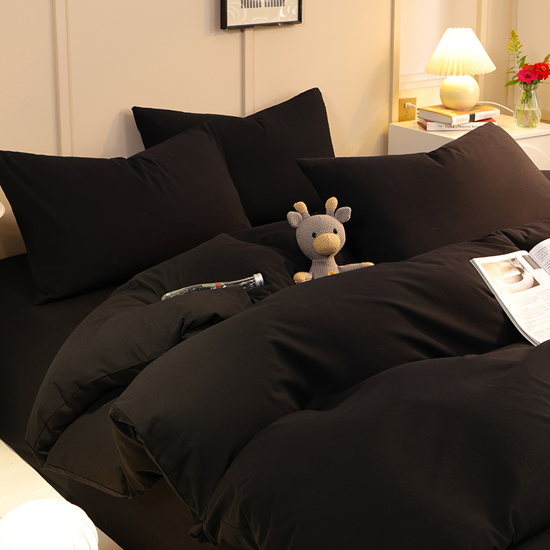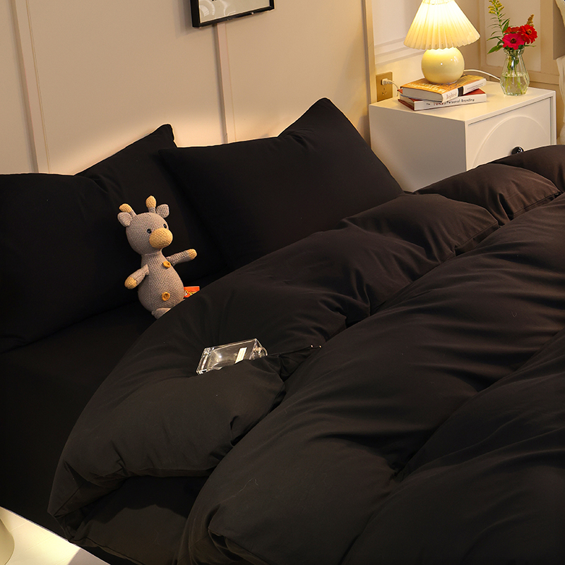 缦绣阁家纺 2025新款亲肤水洗棉纯色双拼四件套简约风床单款床笠款四件套宿舍三件套 纯色酷黑