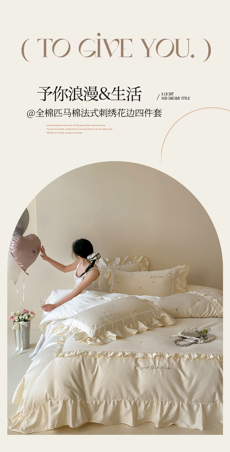 (总)红番天婚庆 2025新款全棉提花全棉贡缎长绒棉法式刺绣花边全棉四件套-蝶梦(活动价控价不低于480),蝶梦-奶油芝芝,蝶梦-浅香槟,蝶梦-星辰灰
