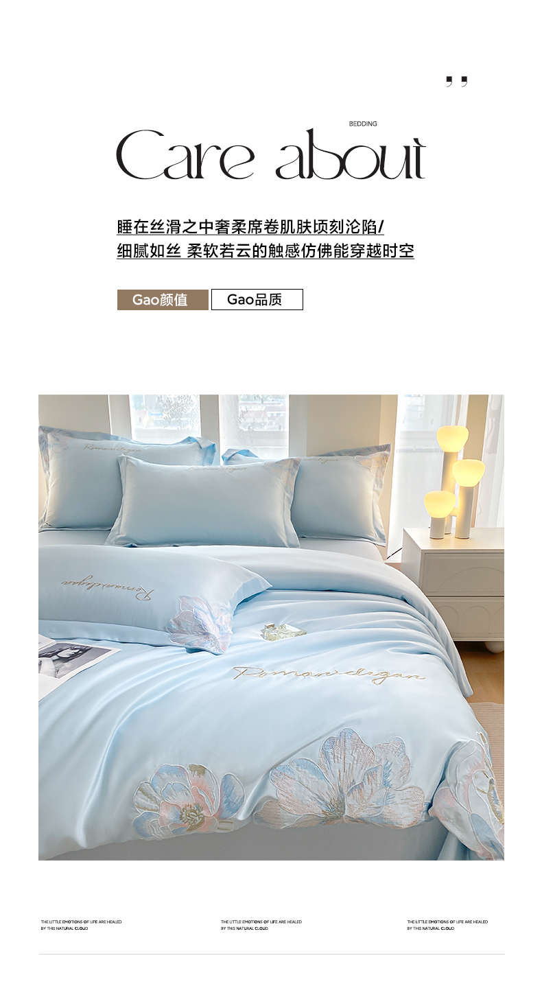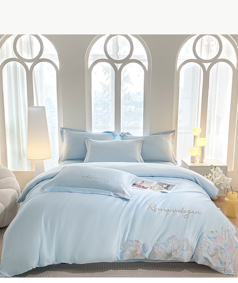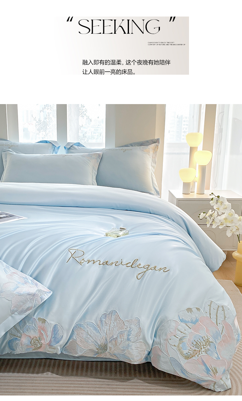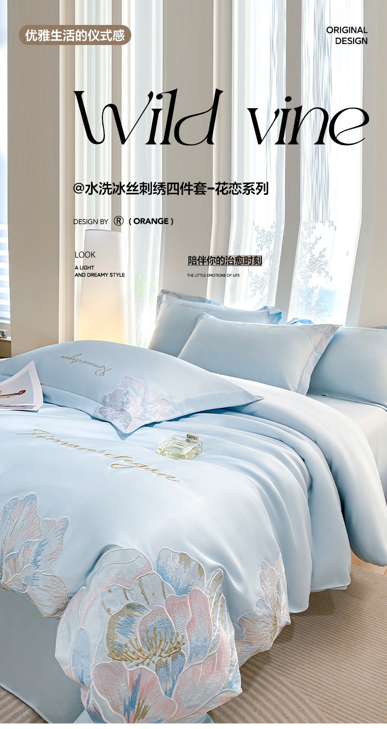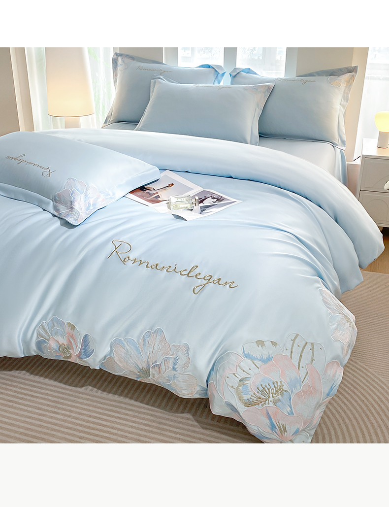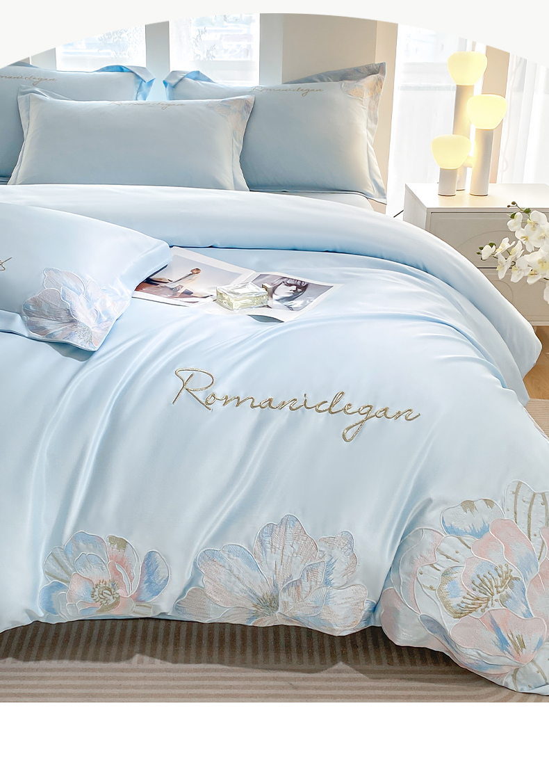 商品名称:花愿(原花纪) 2025新款水洗冰丝刺绣四件套-花恋系列 天空蓝