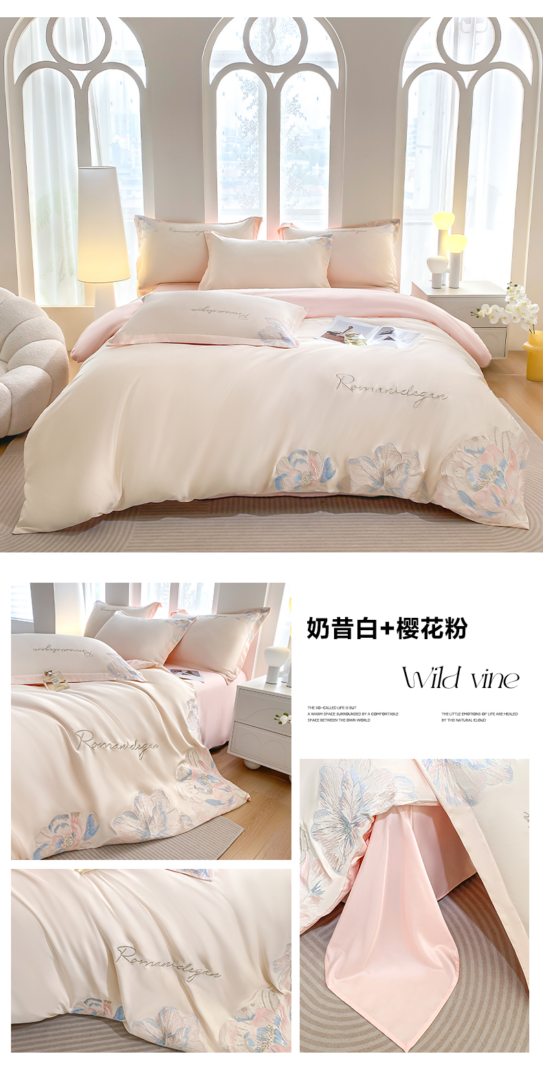 (总)花愿(原花纪) 2025新款水洗冰丝刺绣四件套-花恋系列,奶昔白+天空蓝,奶昔白+樱花粉,天空蓝,樱花粉