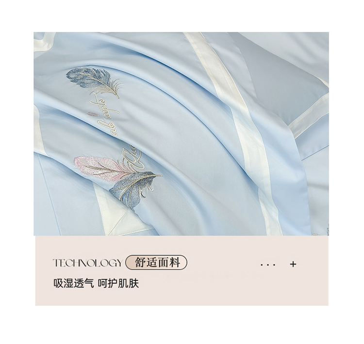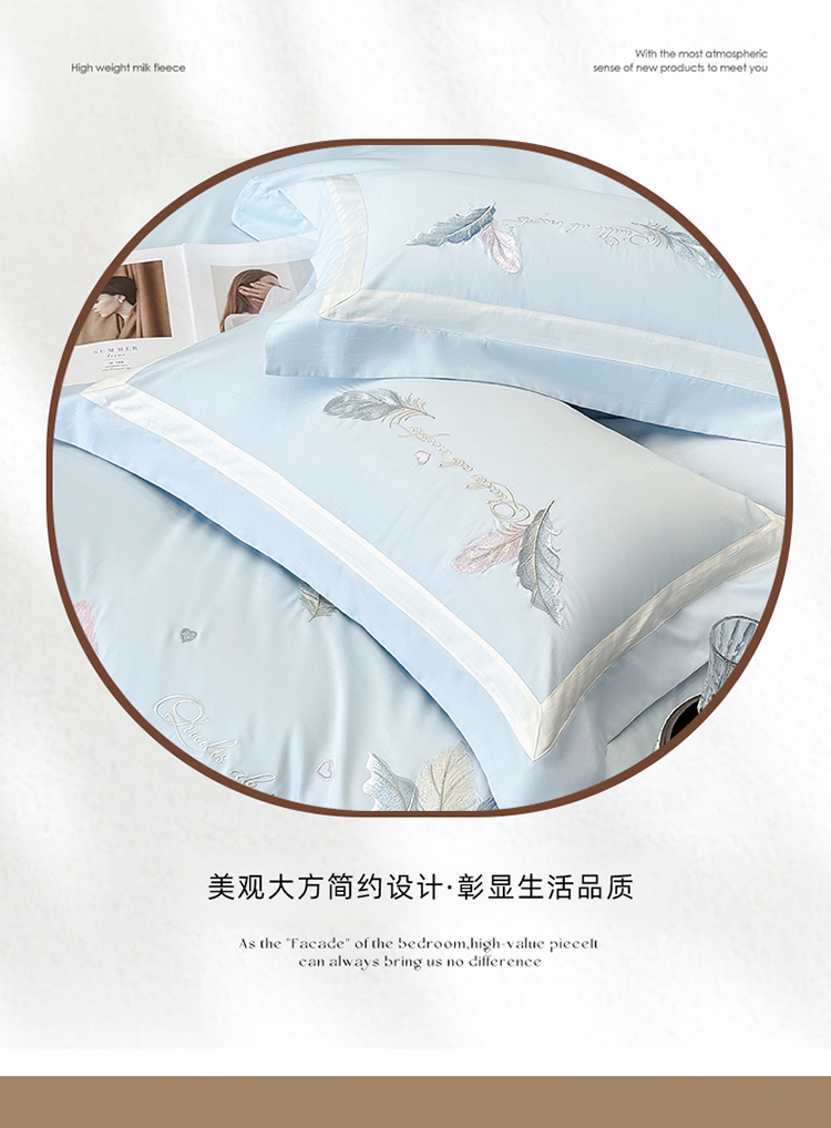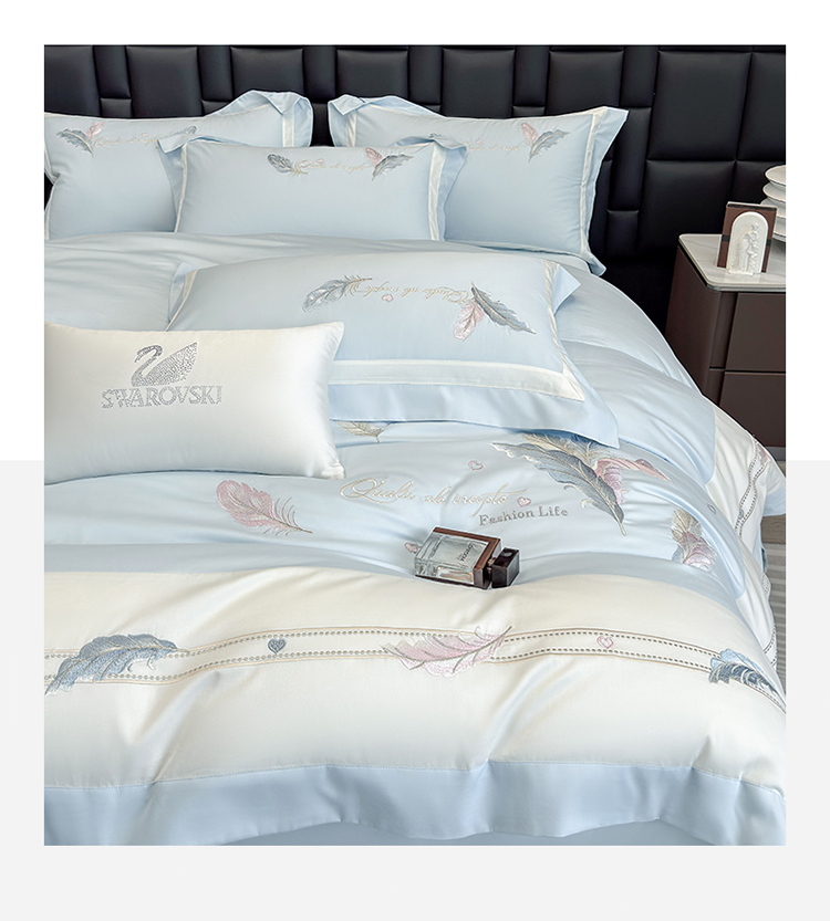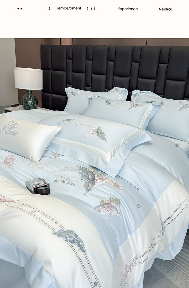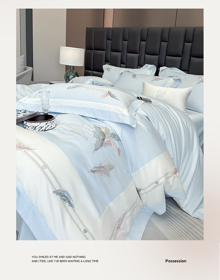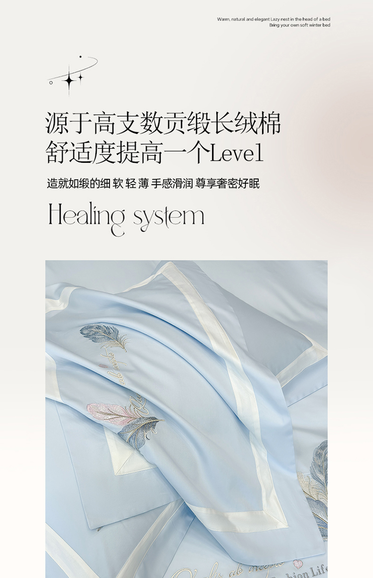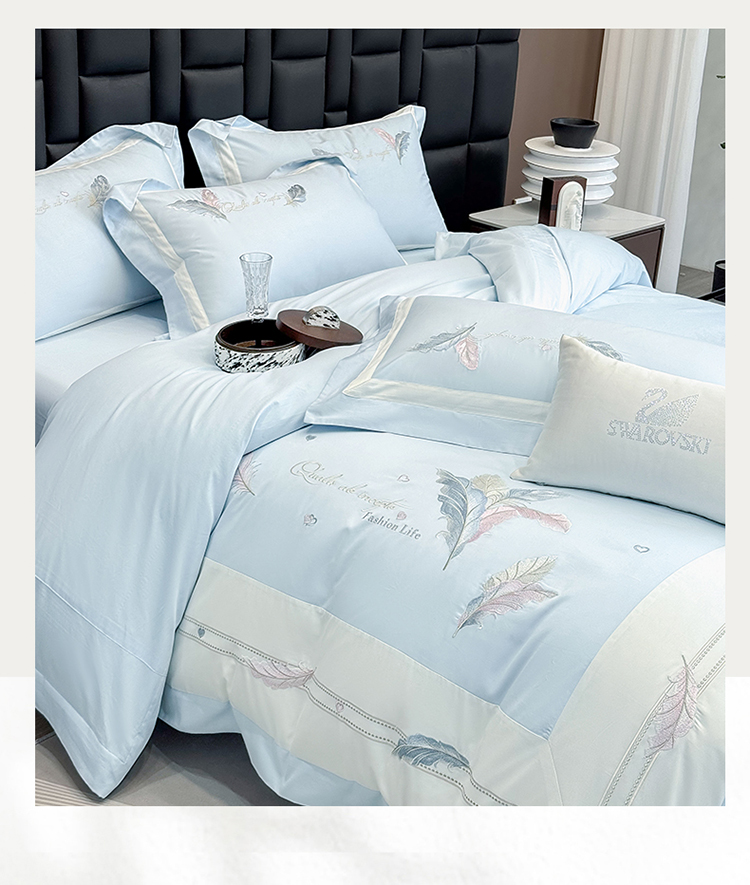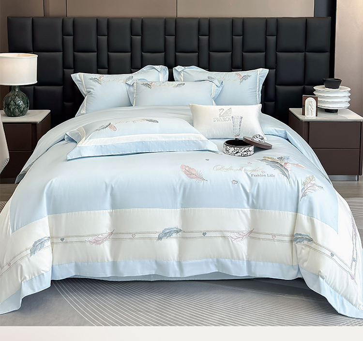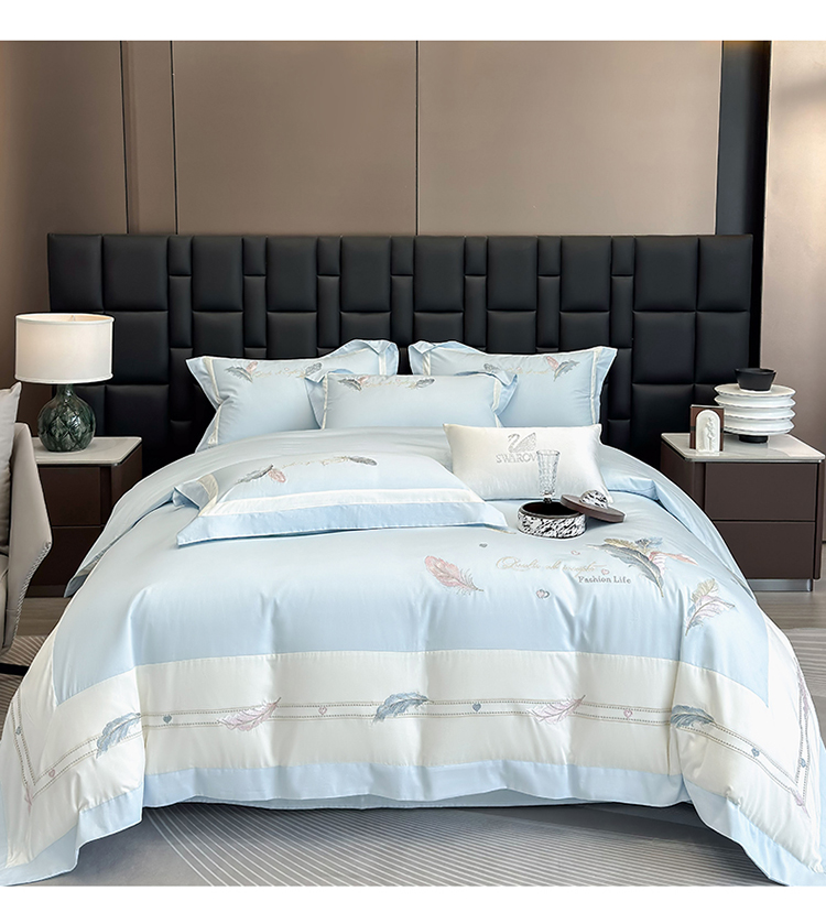 商品名称:春夏新品高级感50*50S贡缎长绒棉刺绣四件套纯棉床单全棉床笠高档礼盒装量大价优 蒂芙尼蓝-彩羽-贡缎长绒棉