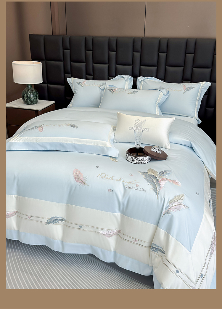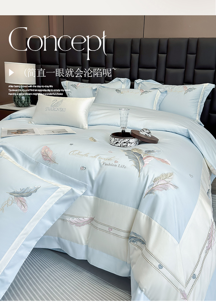 春夏新品高级感50*50S贡缎长绒棉刺绣四件套纯棉床单全棉床笠高档礼盒装量大价优 蒂芙尼蓝-彩羽-贡缎长绒棉
