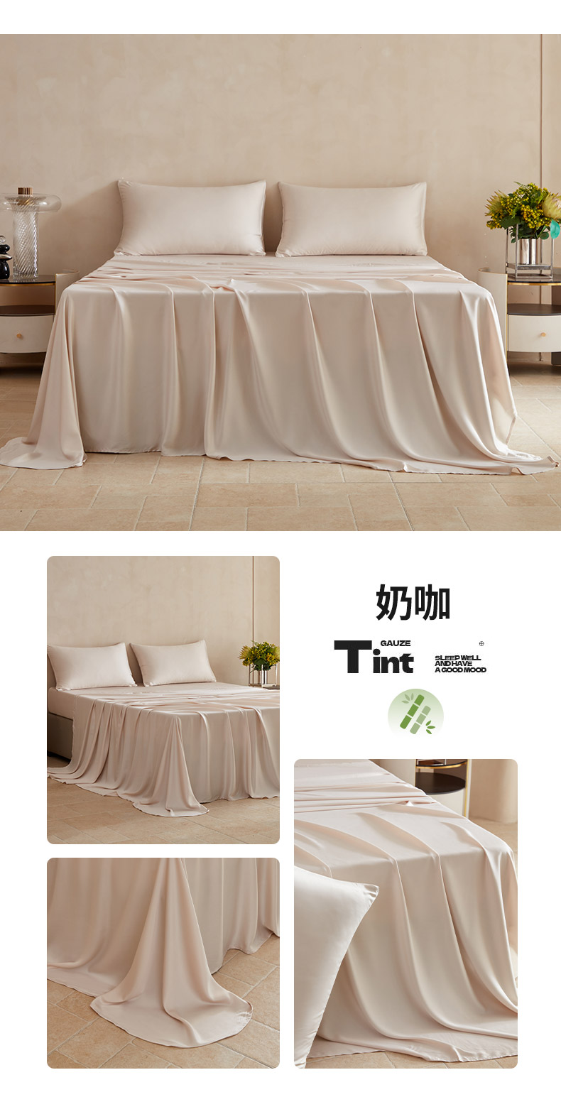 商品名称:轩和家居 2025新款天竹60支竹浆纤维A类婴幼儿级别天然抗菌抑菌系列床单单件-单床单 奶咖