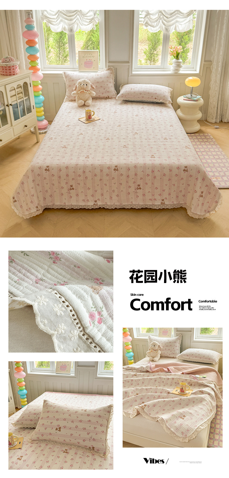 商品名称:源舜 2025新款云感双层纱全棉法式花边床盖三件套 花园小熊