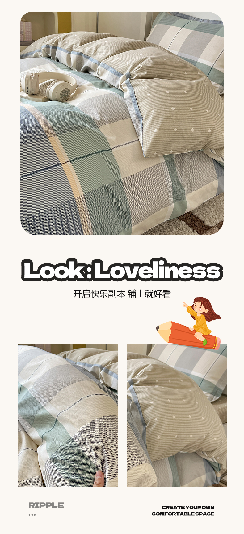 当前位置: 91家纺网 > 商品网购 > 床品套件 > 三件套 > 涵宸家纺 2025新款学生图-全棉印花-甜系三件套四件套 D曼波
