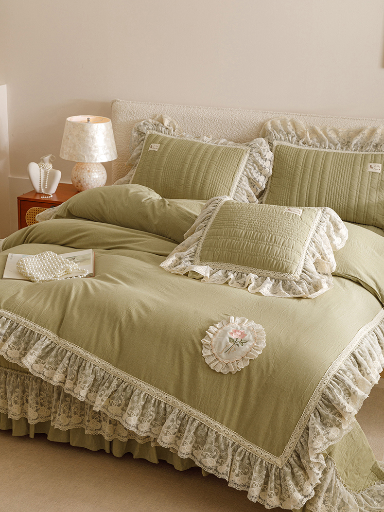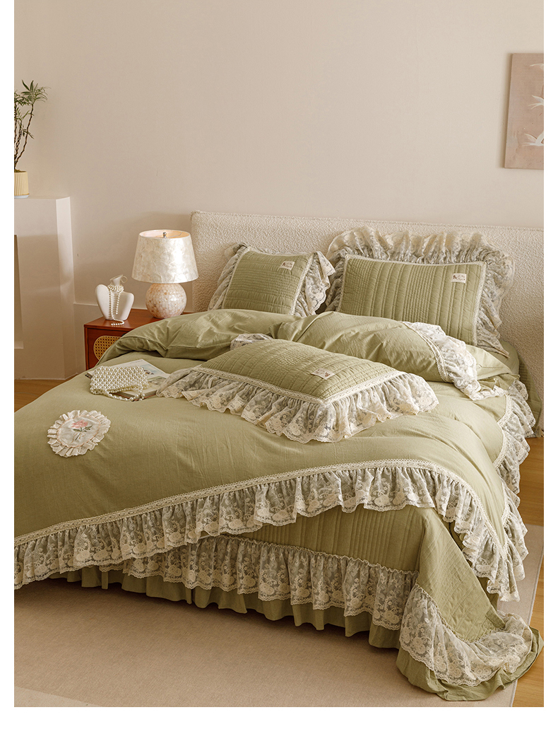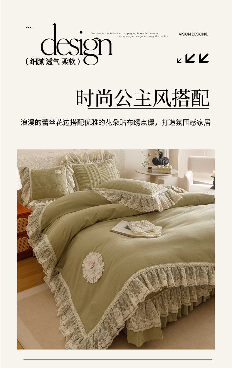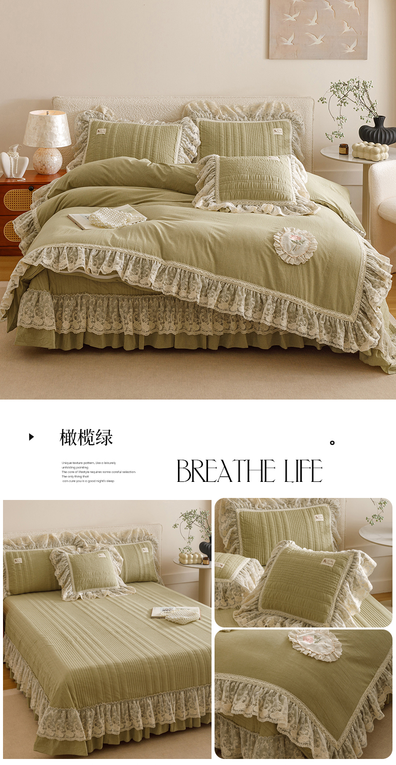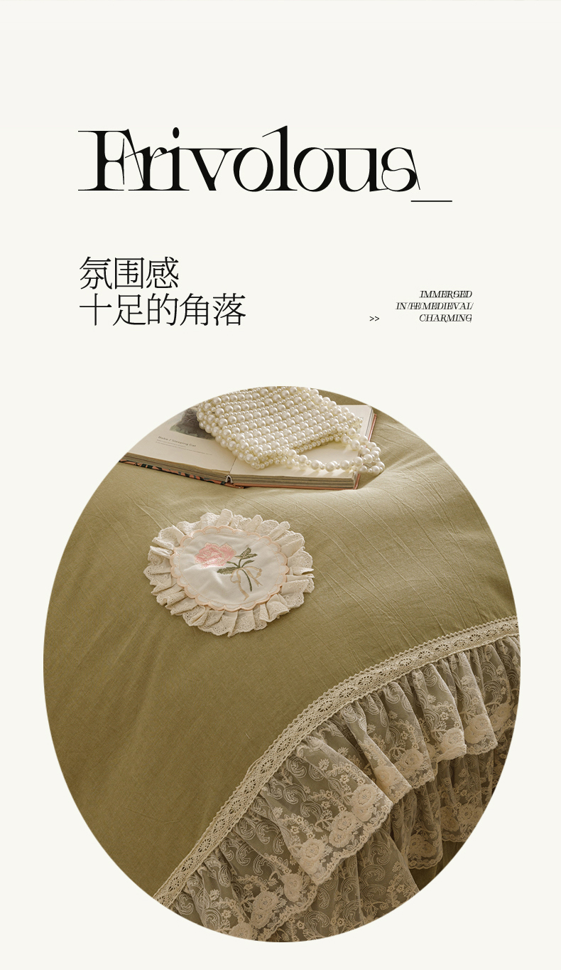 当前位置: 91家纺网 > 商品网购 > 床品套件 > 四件套 > 全棉普通四件套 > 菊上家纺 2025新款全棉色织水洗棉洛丽塔公主床盖款四件套 橄榄绿