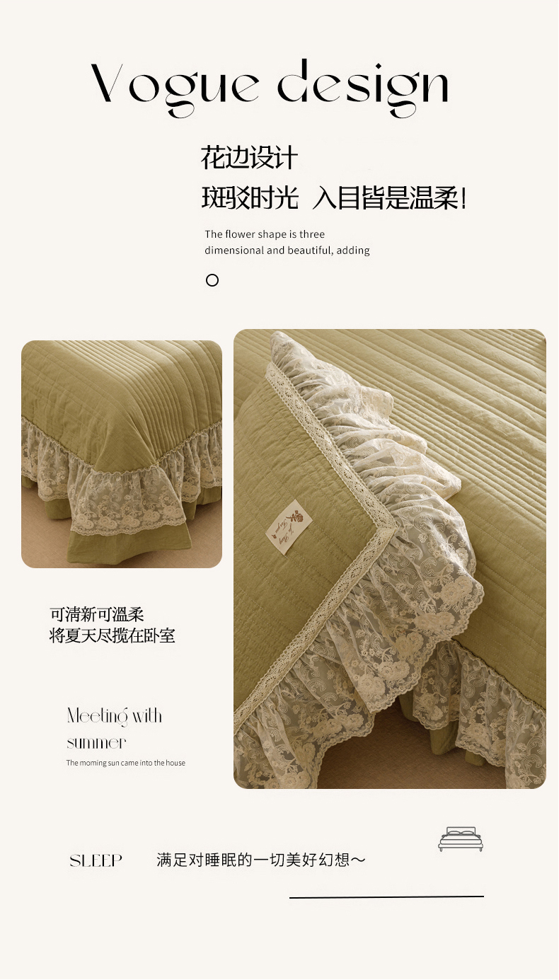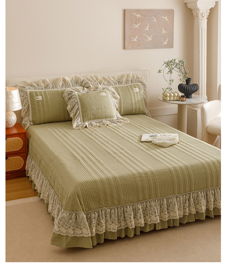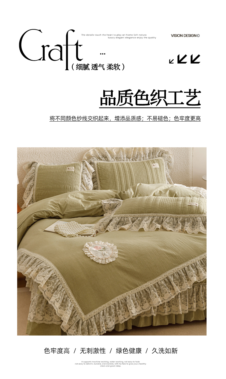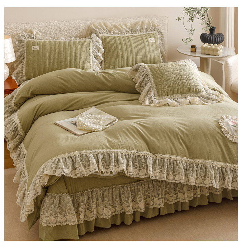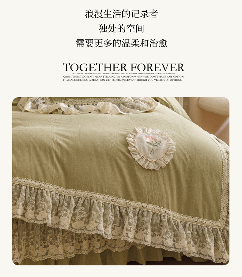 当前位置: 91家纺网 > 商品网购 > 床品套件 > 四件套 > 全棉普通四件套 > 菊上家纺 2025新款全棉色织水洗棉洛丽塔公主床盖款四件套 橄榄绿