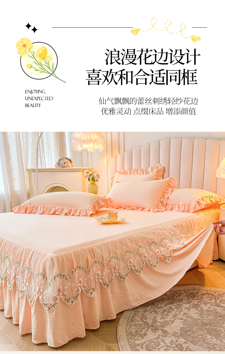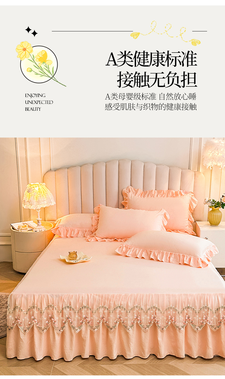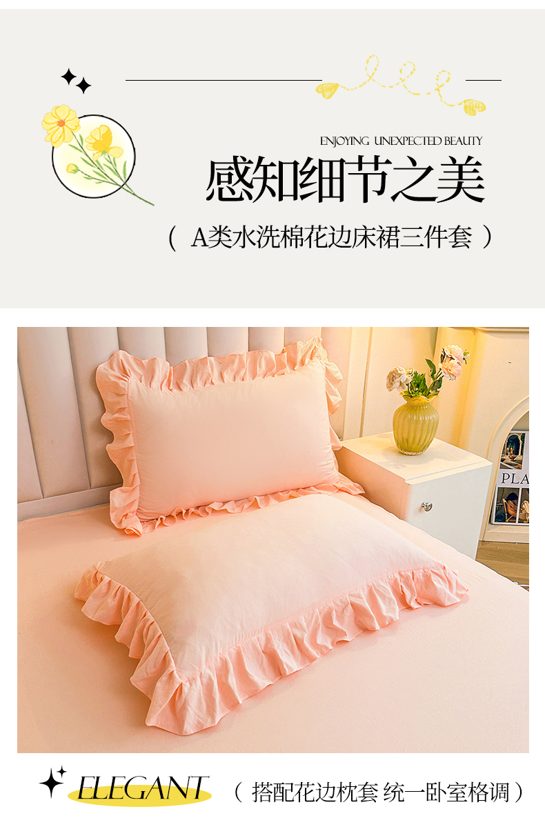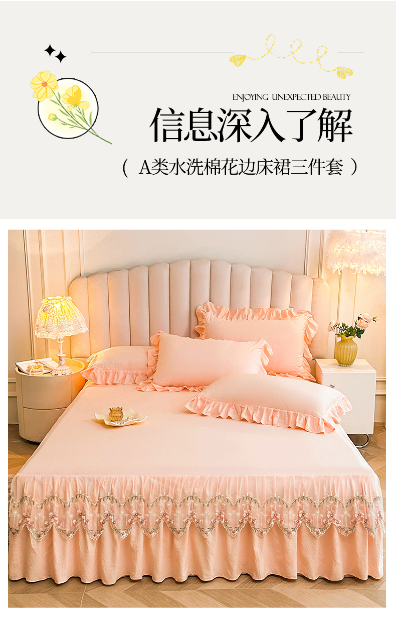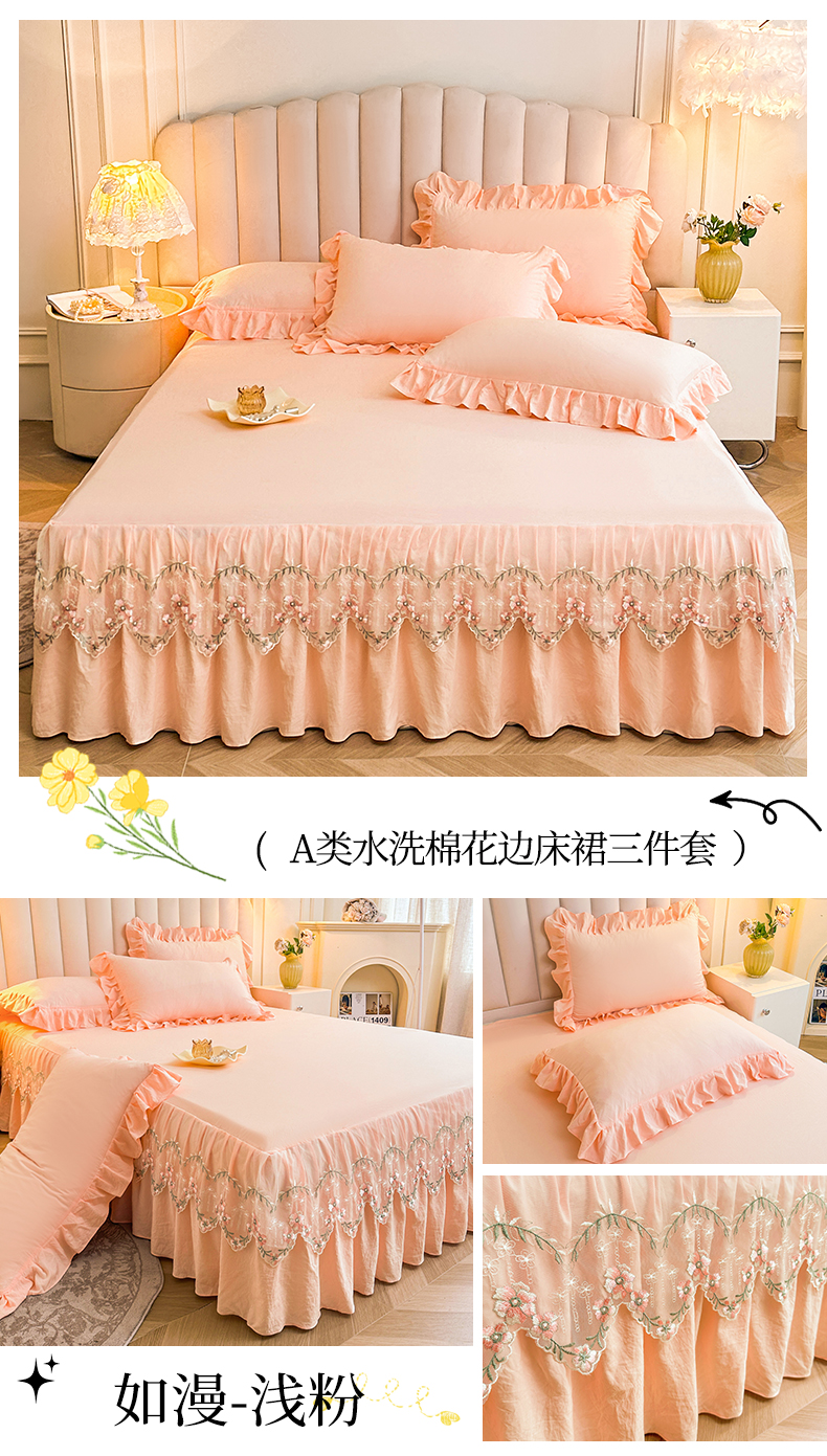 当前位置: 91家纺网 > 商品网购 > 床品套件 > 三件套 > 好儿喜家纺 2025新款A类水洗棉花边床裙蕾丝床罩三件套-如漫 如漫-浅粉