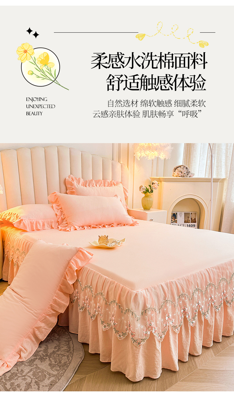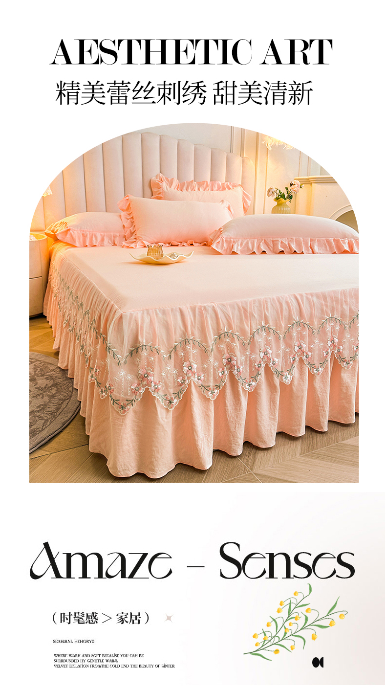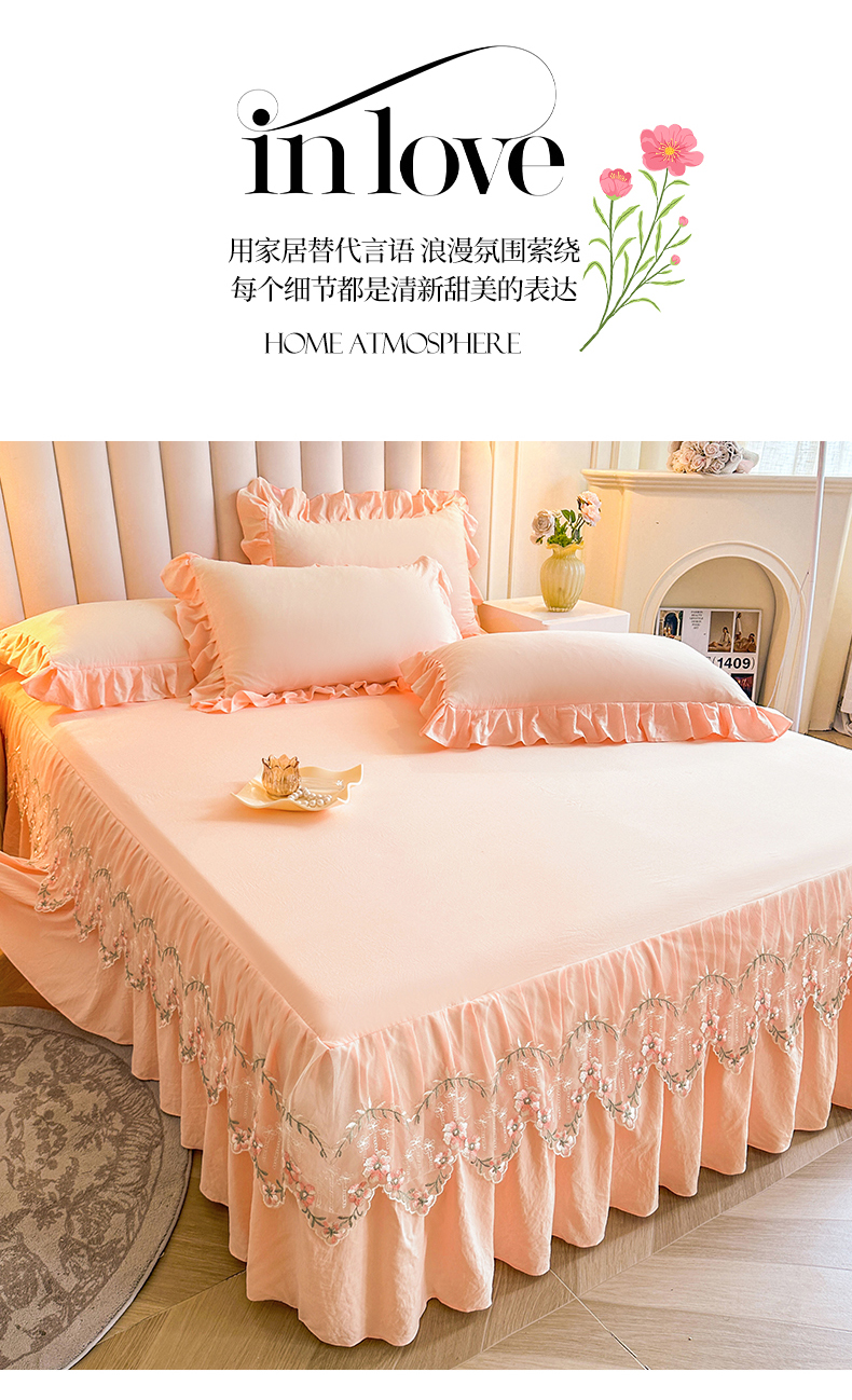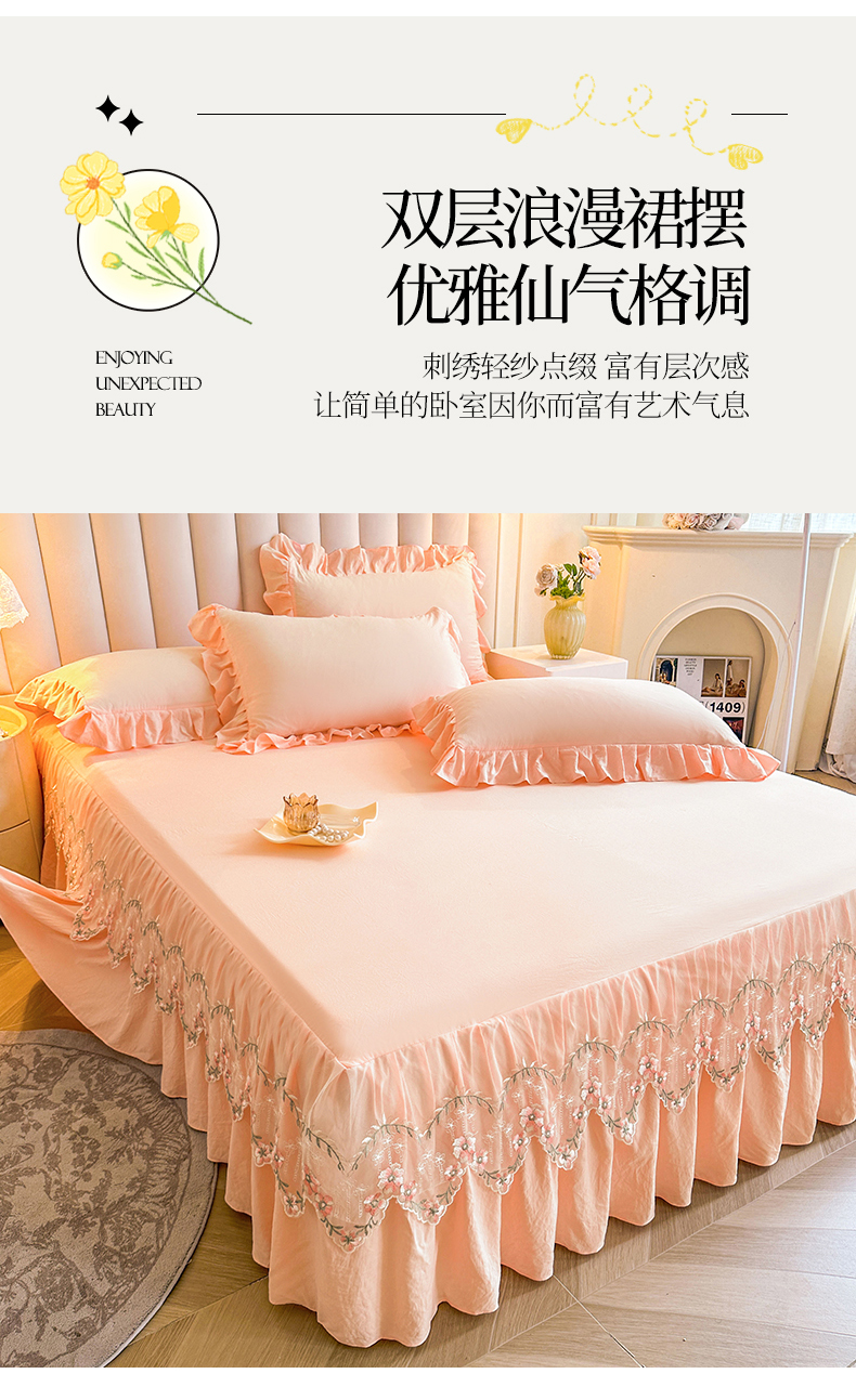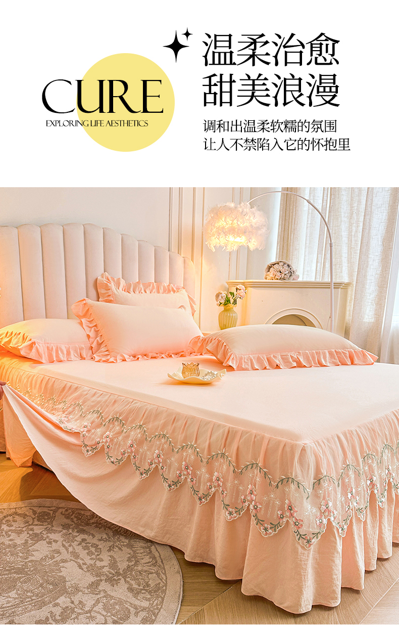当前位置: 91家纺网 > 商品网购 > 床品套件 > 三件套 > 好儿喜家纺 2025新款A类水洗棉花边床裙蕾丝床罩三件套-如漫 如漫-浅粉