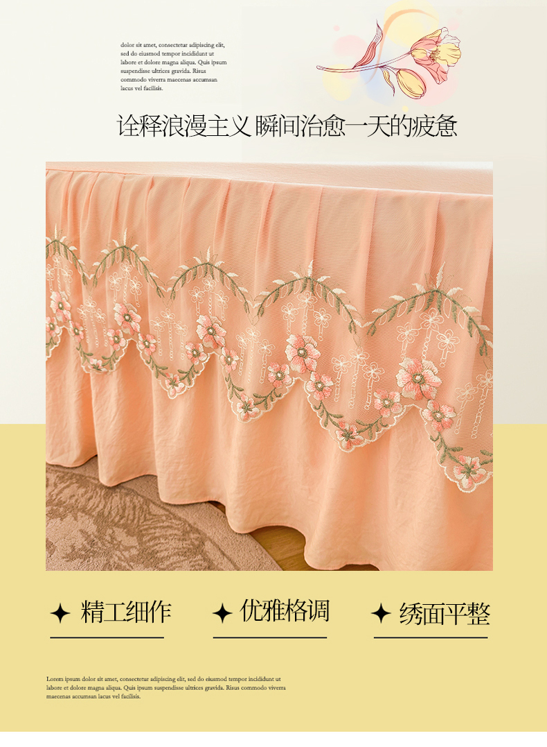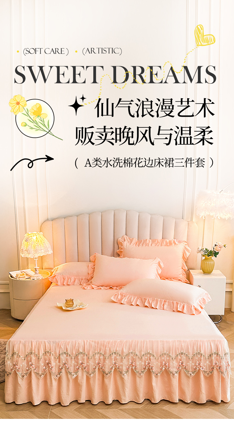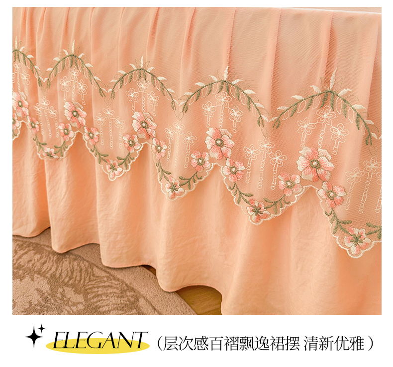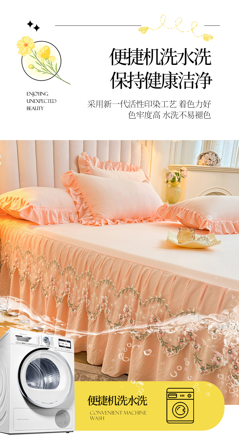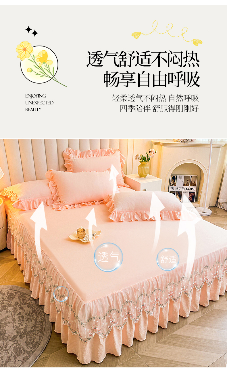 当前位置: 91家纺网 > 商品网购 > 床品套件 > 三件套 > 好儿喜家纺 2025新款A类水洗棉花边床裙蕾丝床罩三件套-如漫 如漫-浅粉