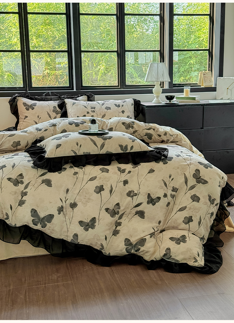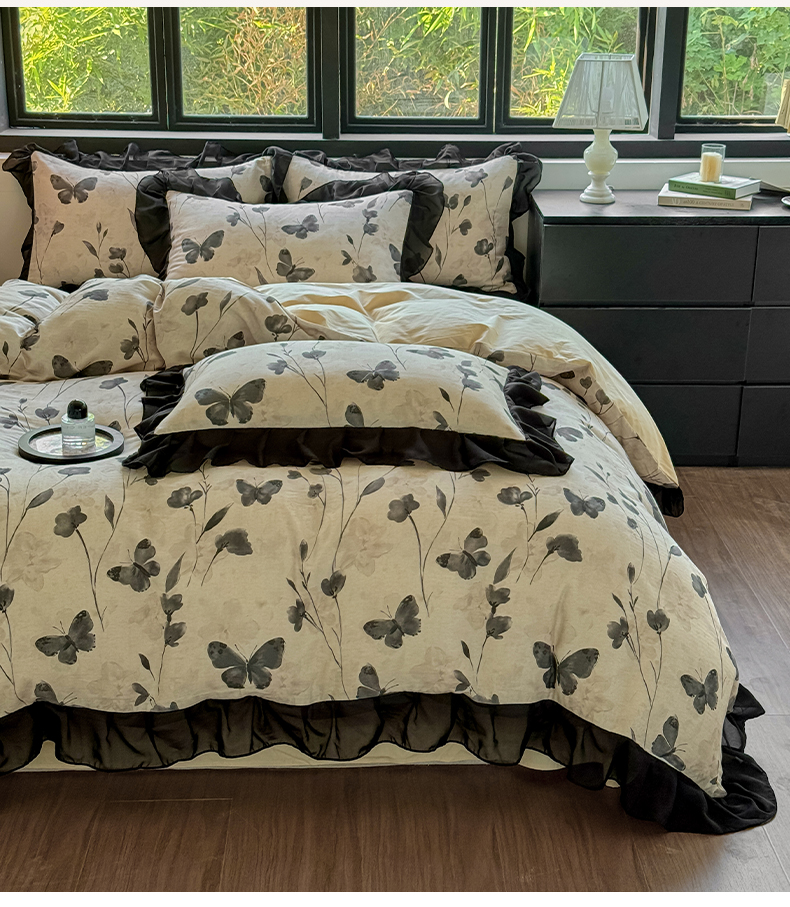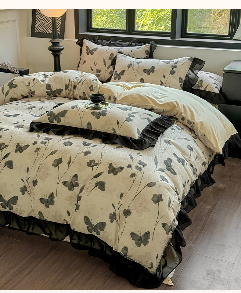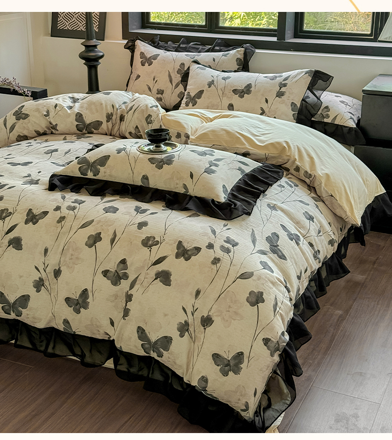 商品名称:宅家居 2025新款A类轻法式复古赫本风全棉纯棉有氧双层纱花边四件套黑色韩式花边三件套 蝶梦-奶咖