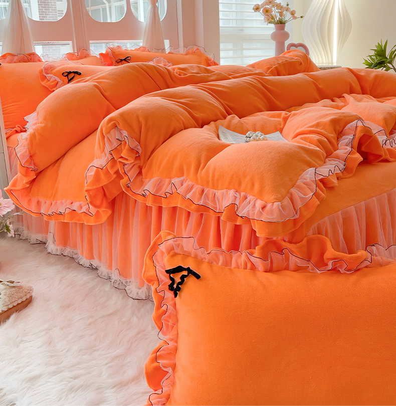 言熙居家纺 2025新款仙气网纱蕾丝花边蝴蝶结牛奶绒四件套 仙女桔