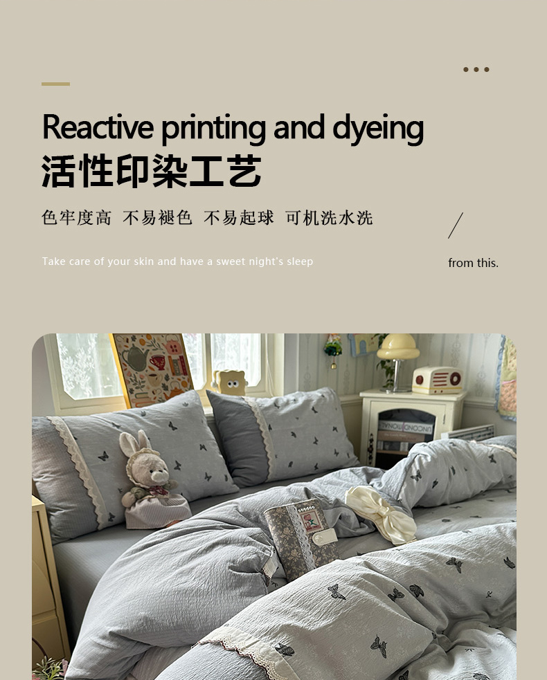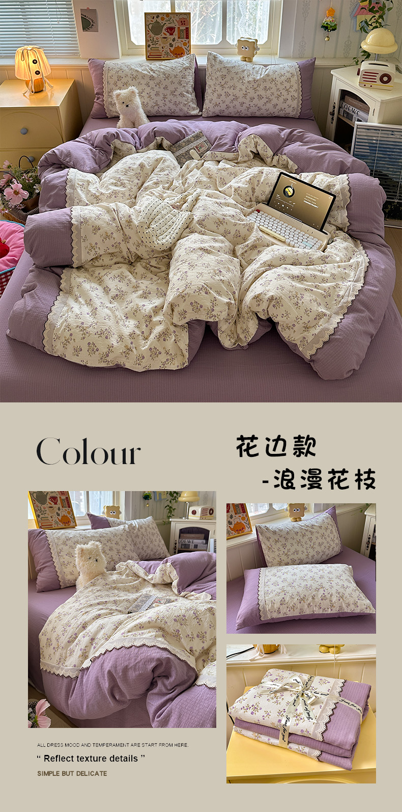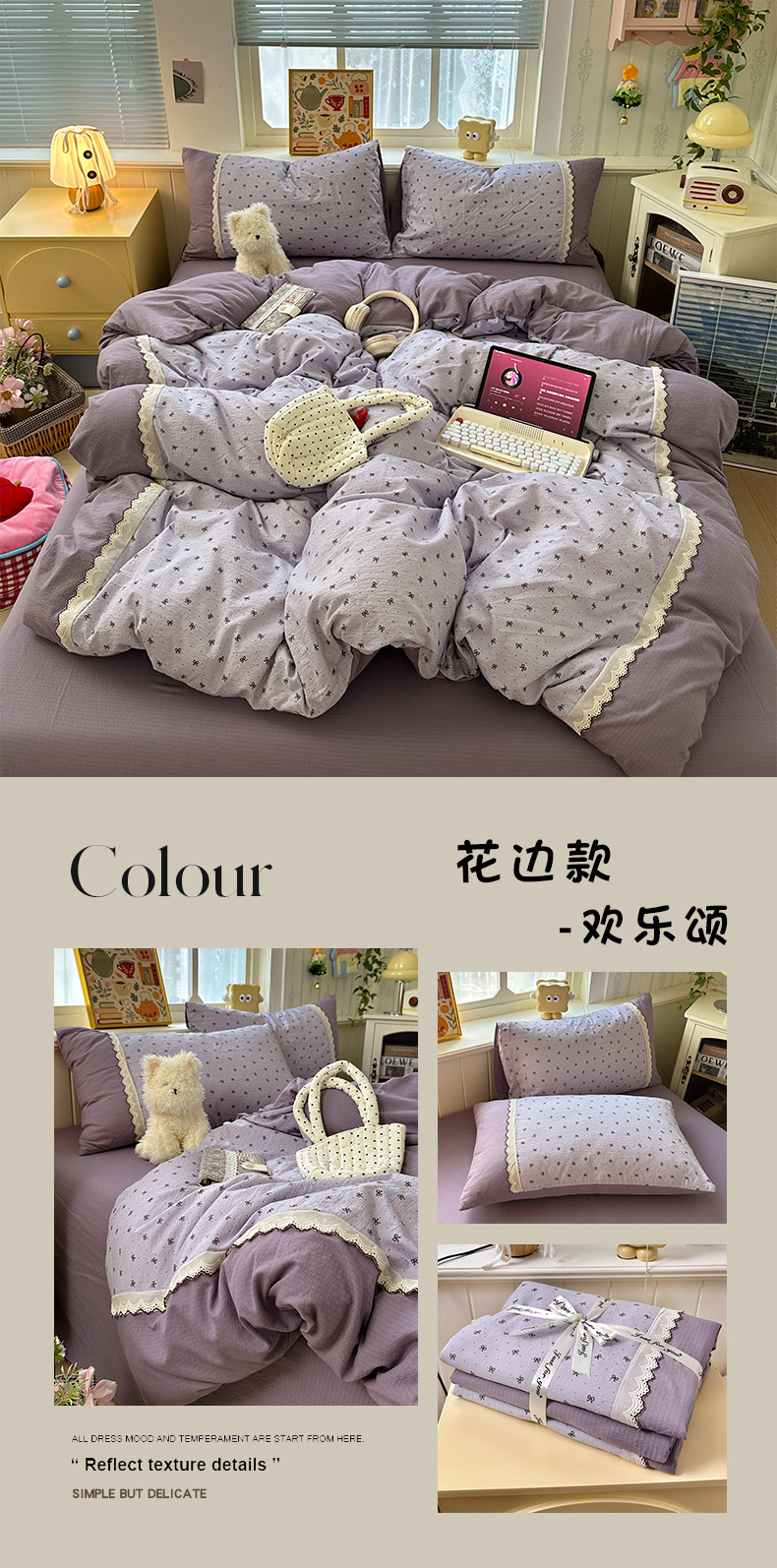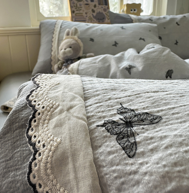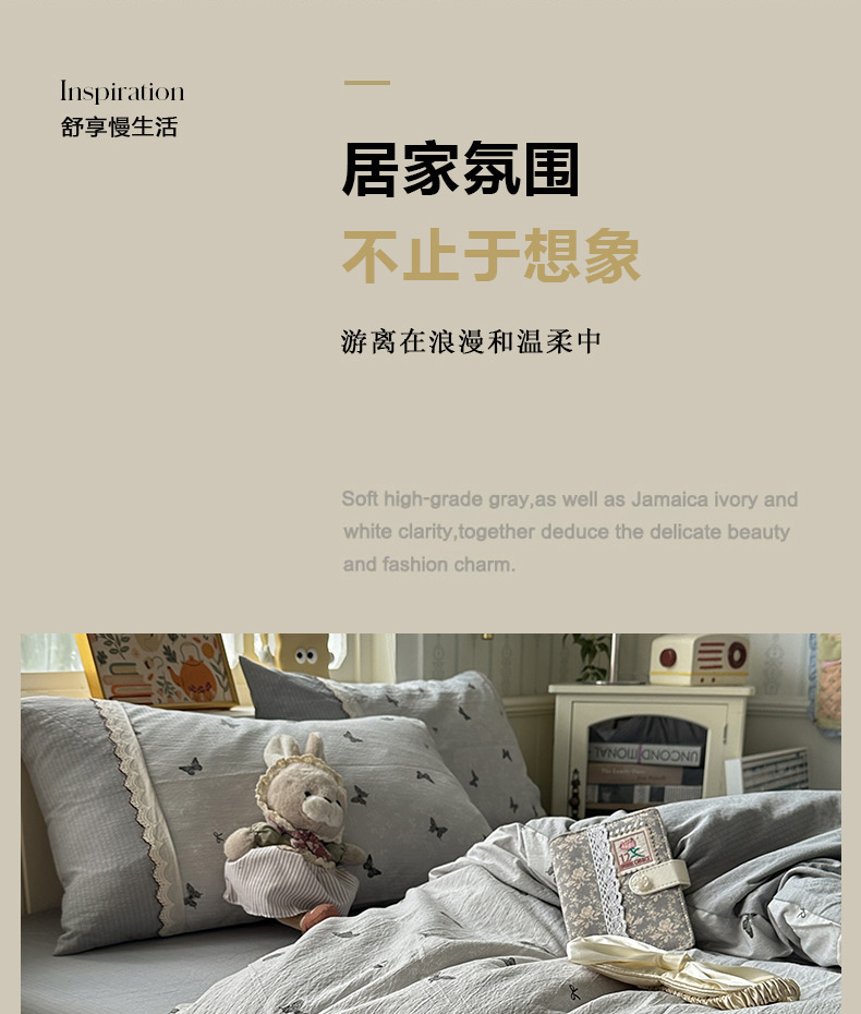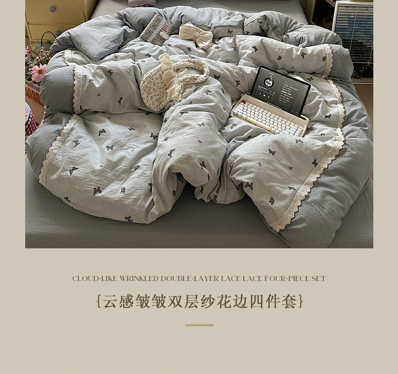 当前位置: 91家纺网 > 商品网购 > 床品套件 > 四件套 > 全棉普通四件套 > 水墨江南 2025新款云感皱皱纱全棉花边四件套场景一 花边款-蝴蝶灰