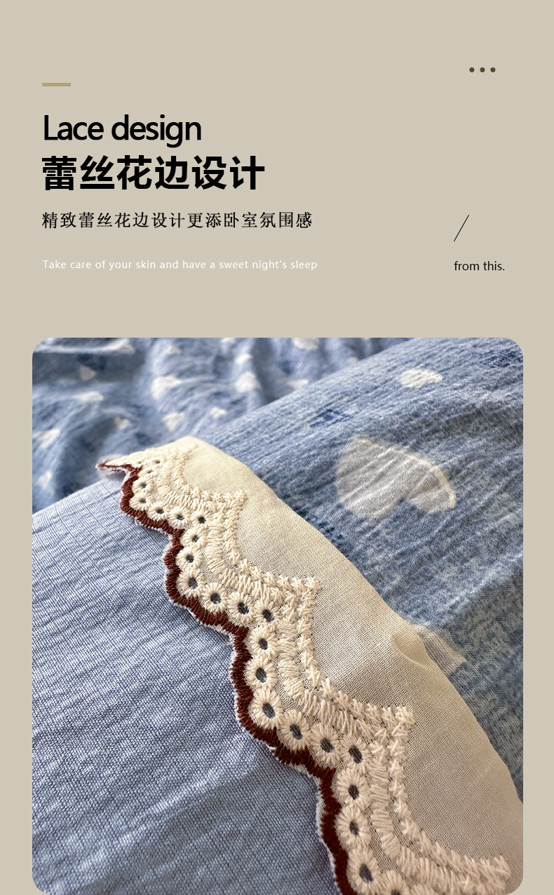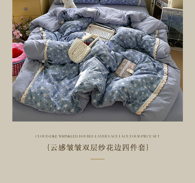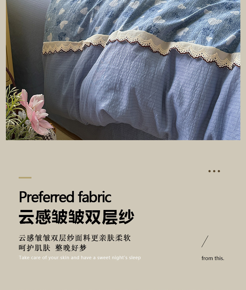 当前位置: 91家纺网 > 商品网购 > 床品套件 > 四件套 > 全棉普通四件套 > 水墨江南 2025新款云感皱皱纱全棉花边四件套场景一 花边款-小确幸