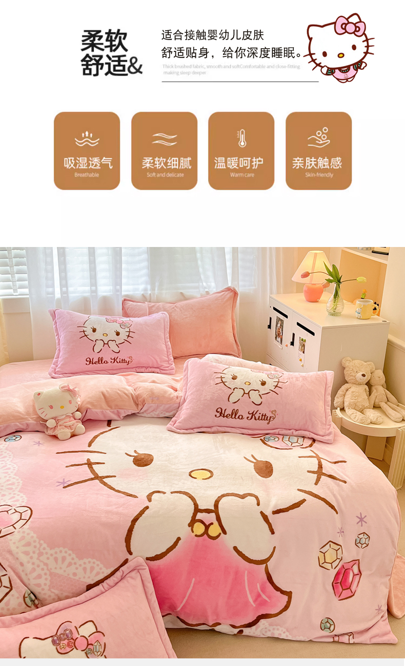 商品名称:(总)金爱家 2025新款正版三丽鸥授权大版卡通平网数码印花加厚高克重牛奶绒系列四件套-第二批