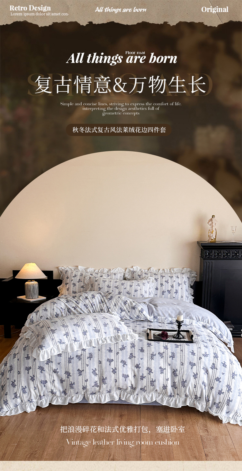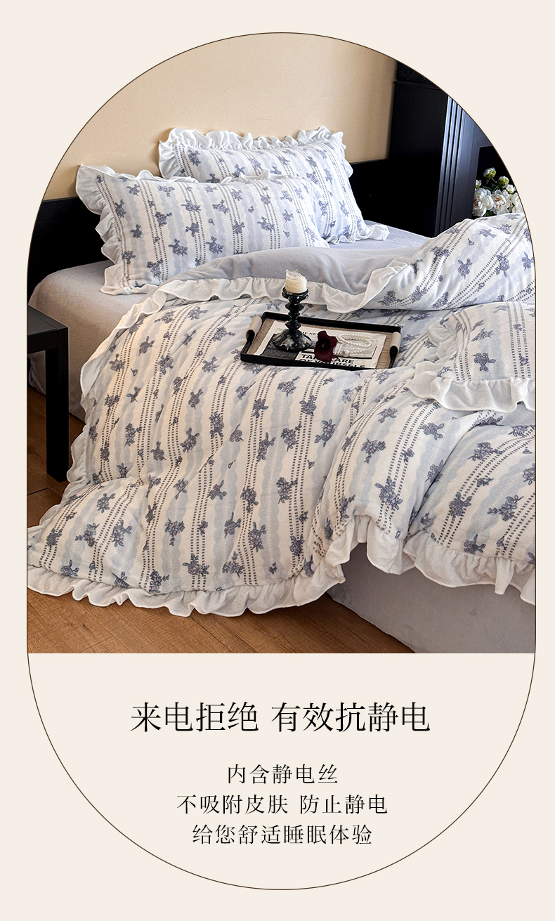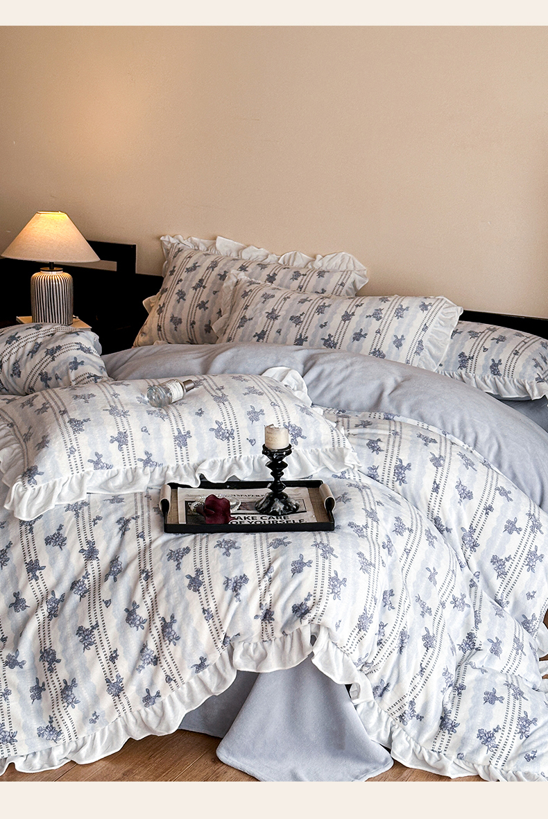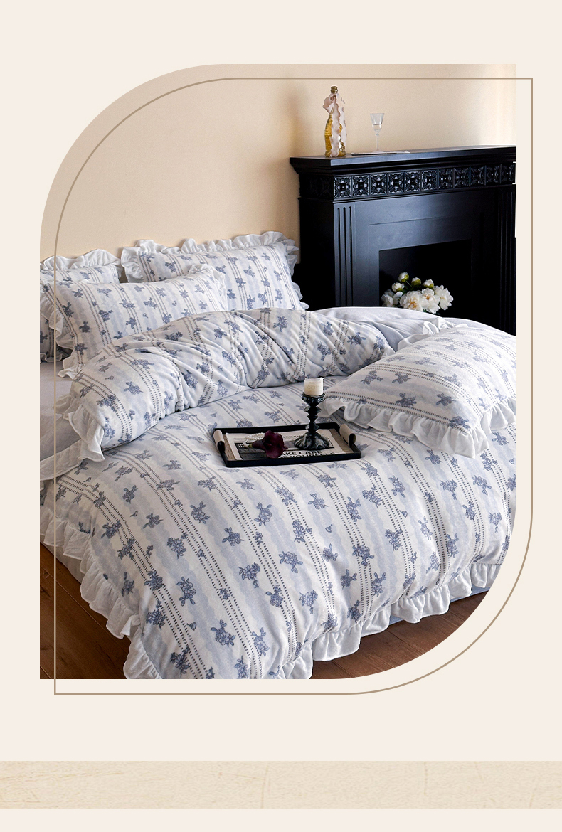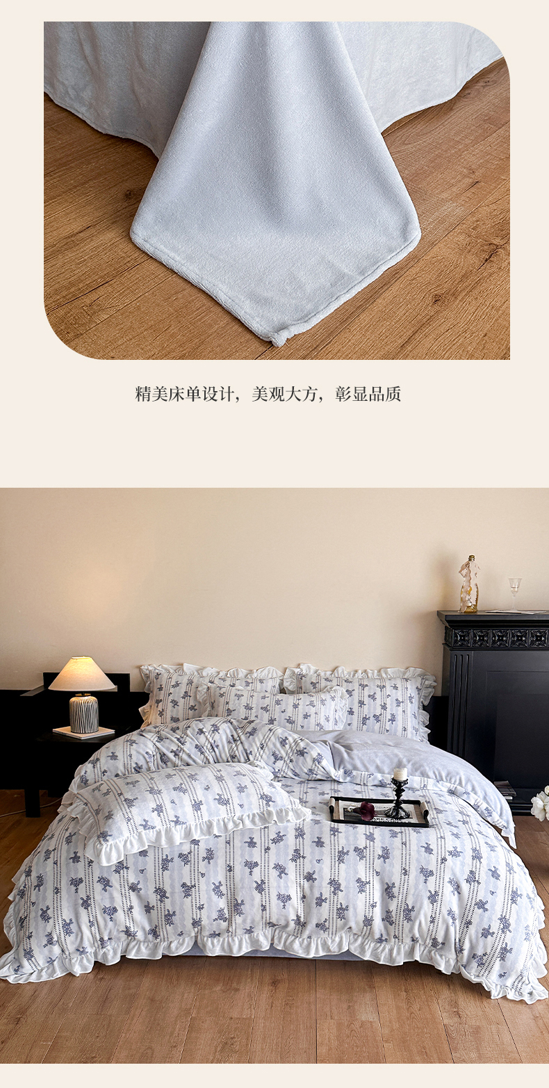 商品名称:三朵家纺 2025新款秋冬法式复古风法莱绒花边四件套 青黛