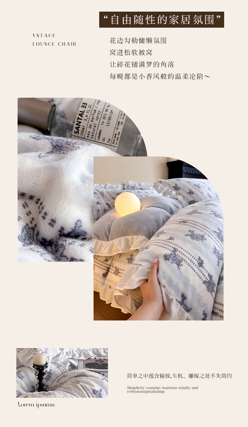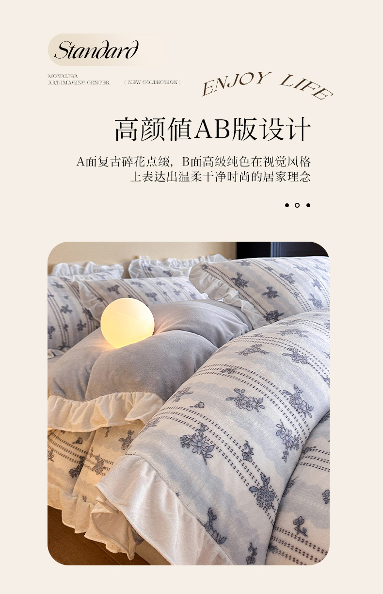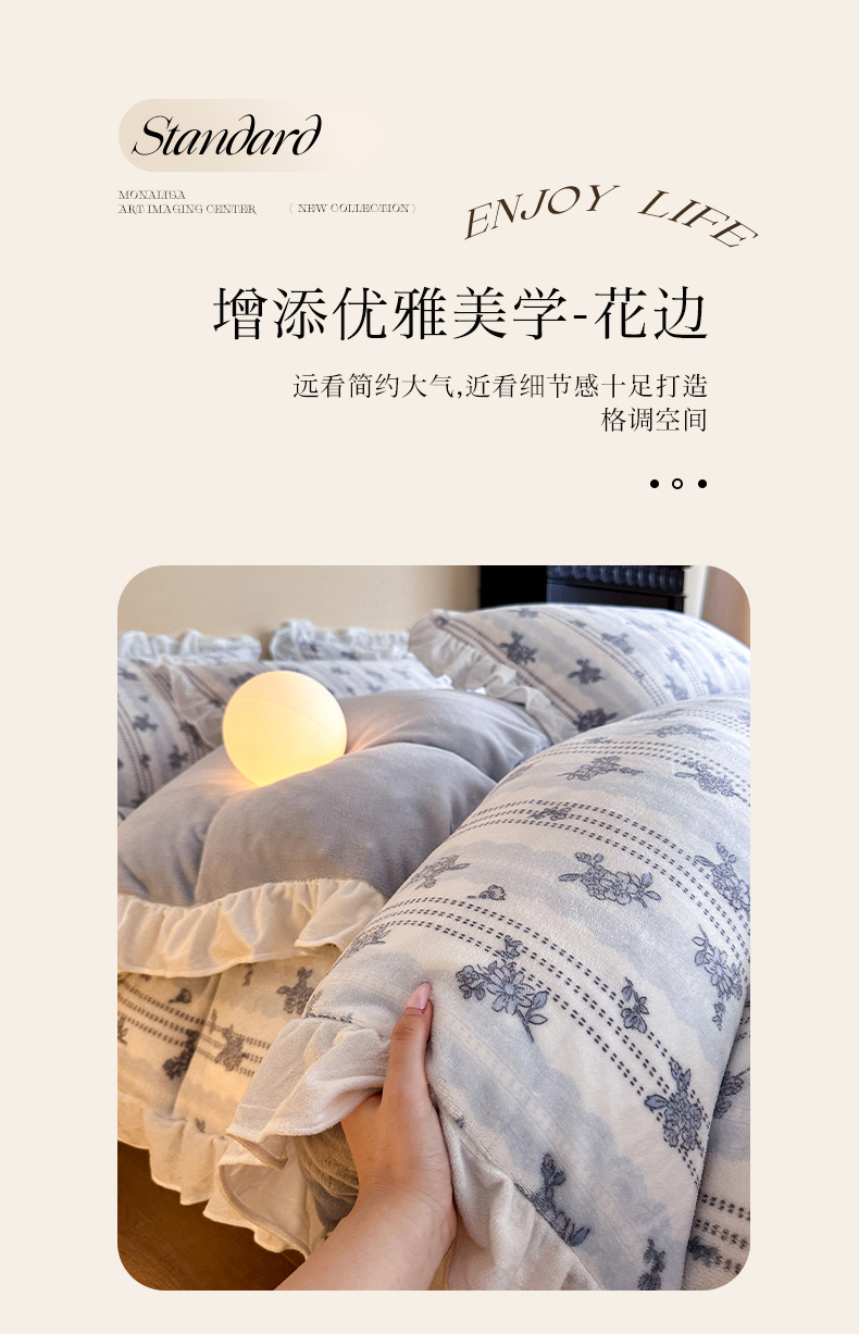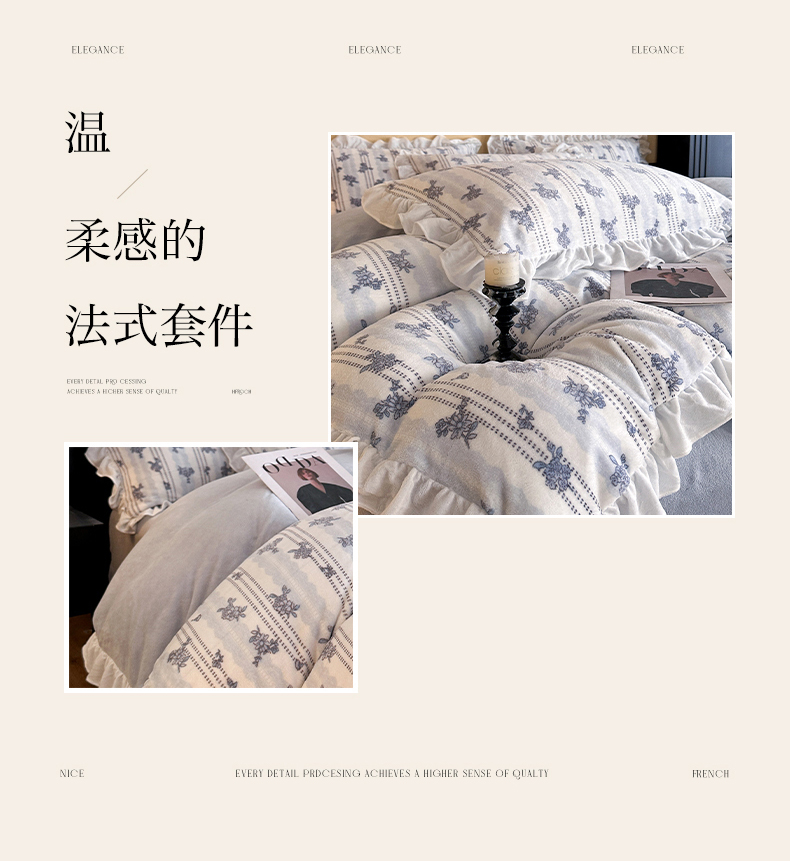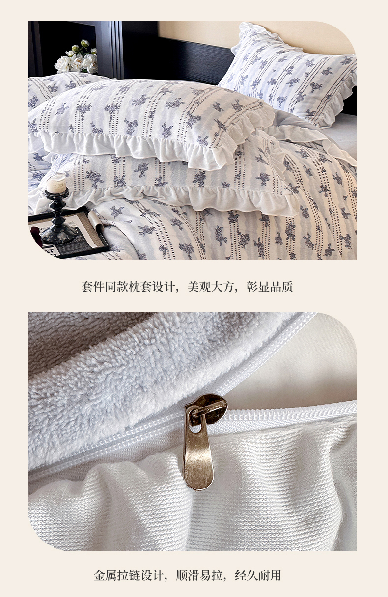商品名称:三朵家纺 2025新款秋冬法式复古风法莱绒花边四件套 青黛