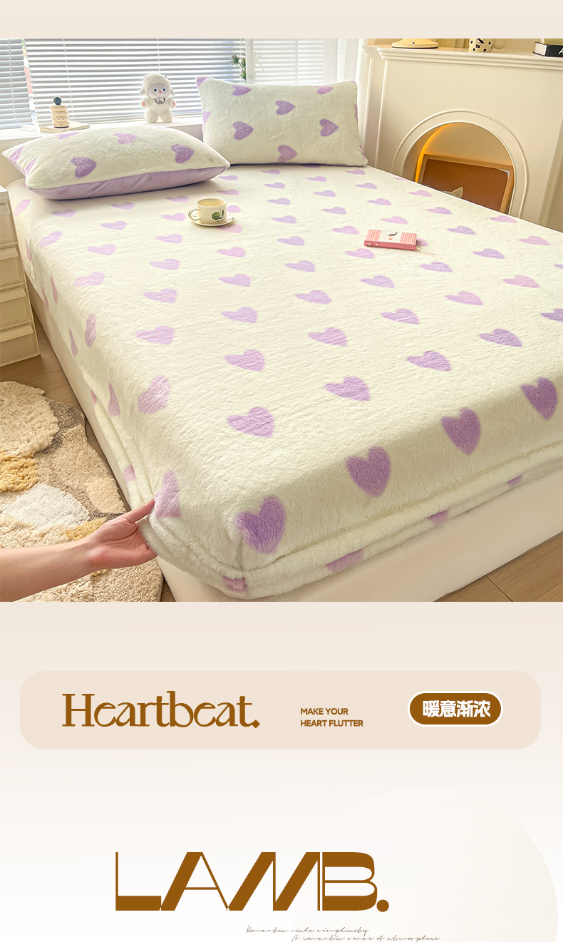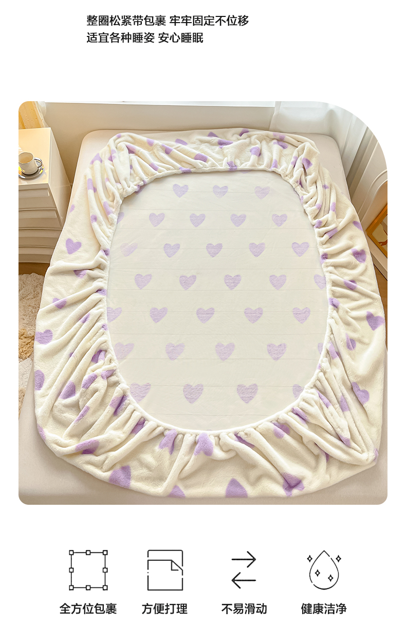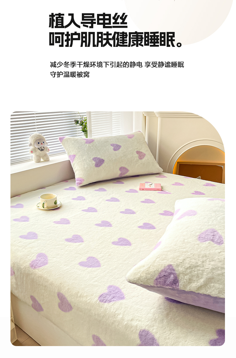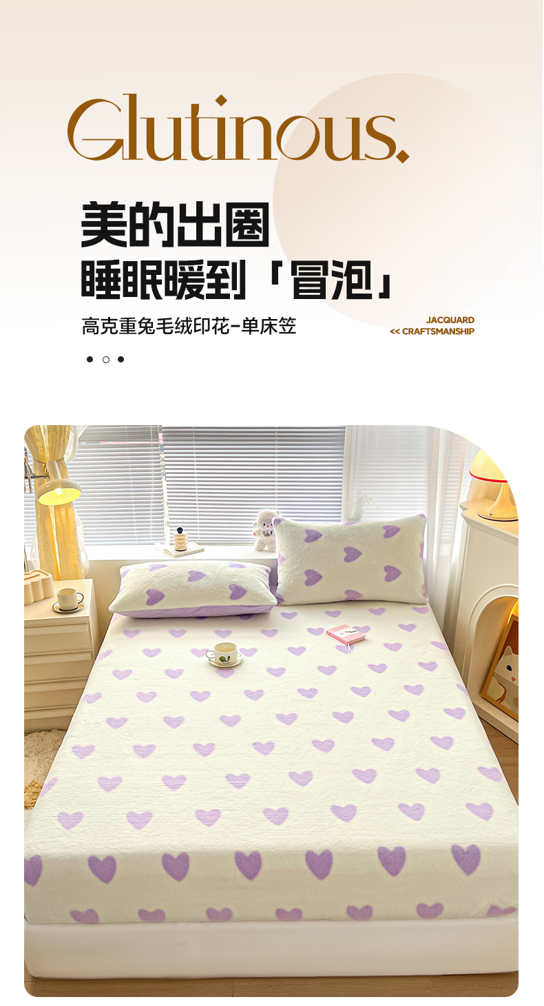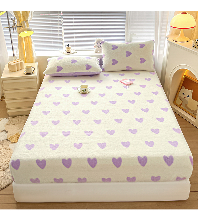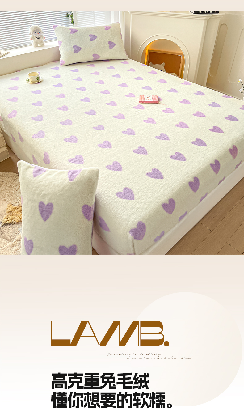 商品名称:雅居纺家纺 2025新款高克重兔绒印花单床笠-爱心 爱心-紫