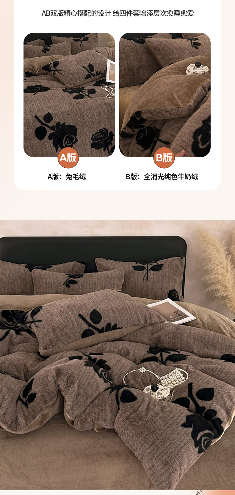商品名称:铠畅家纺 2025新款美拉德风格兔毛绒床单四件套 美拉德-绽放咖