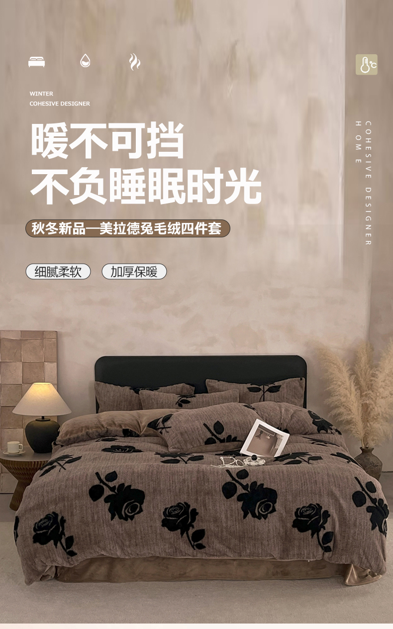 铠畅家纺 2025新款美拉德风格兔毛绒床单四件套 美拉德-绽放咖