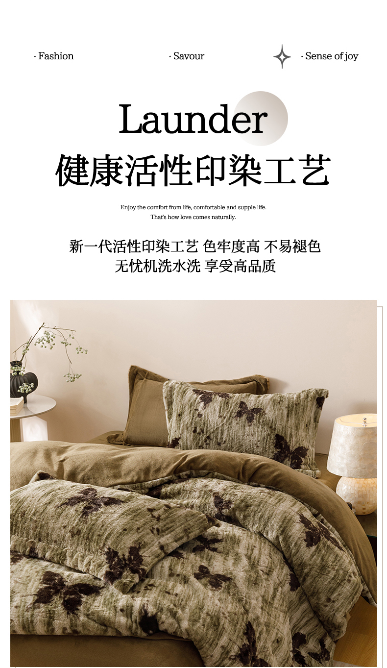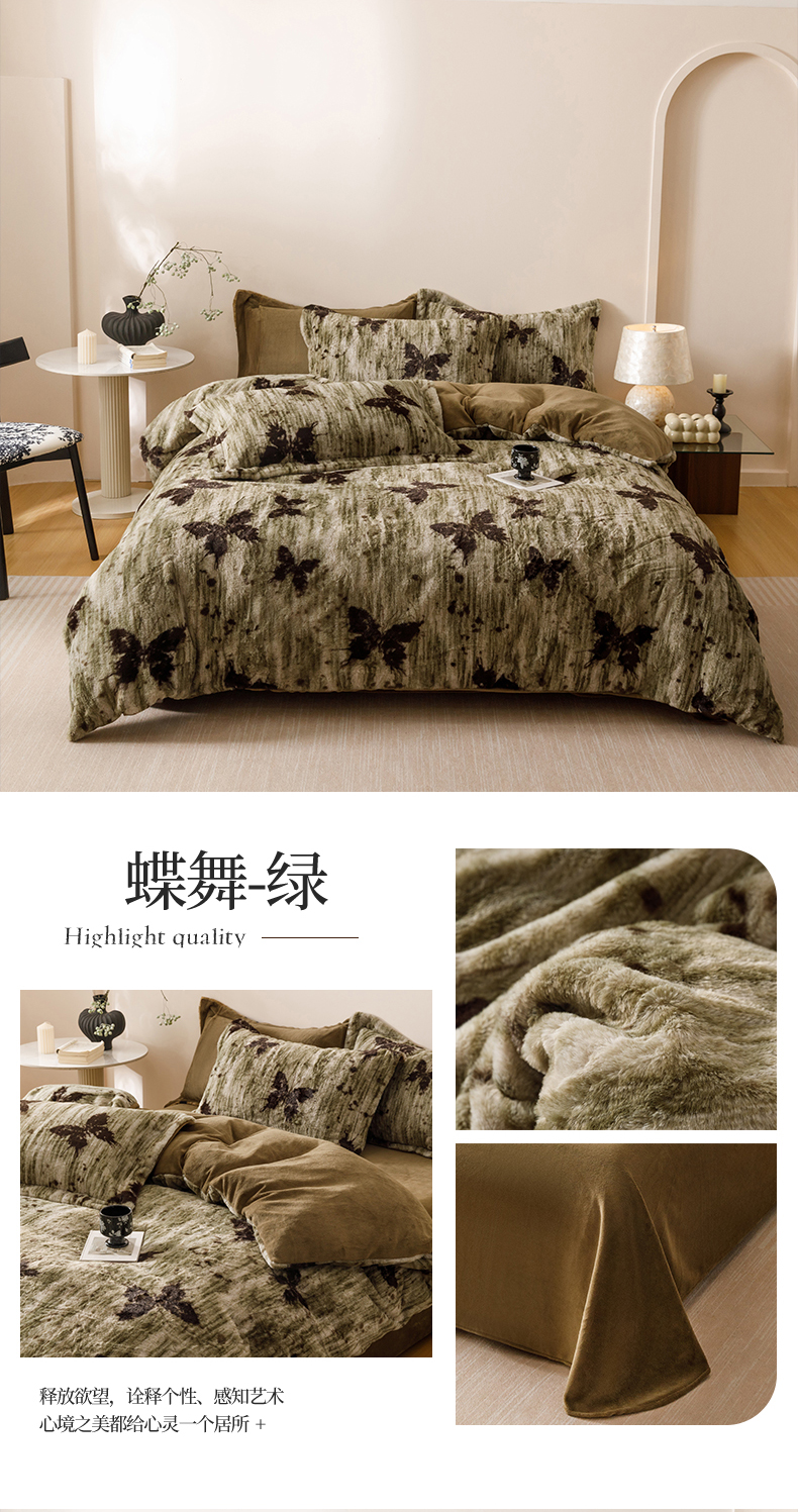 商品名称:艾莱家纺 2025新款A类美拉德系兔绒超柔保暖四件套 蝶舞-绿
