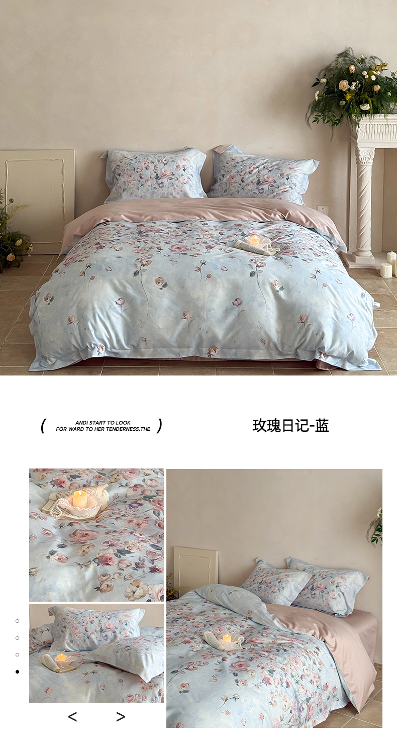 禾时 2025新款天丝棉磨毛数码印花四件套 玫瑰日记-蓝