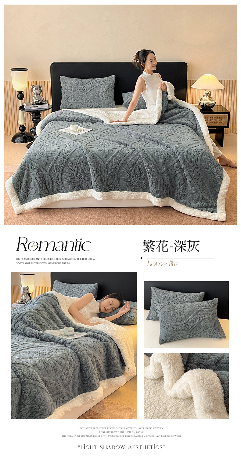 商品名称:莱家富 2026新款双层提花塔芙绒绒羊羔绒毛毯-繁花系列双层毯(可供跨境压缩) 繁花-深灰