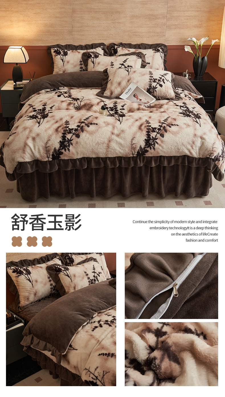 商品名称:金鹰 2025新款A类兔毛绒夹棉床裙四件套加厚牛奶绒四件套 爱意玫瑰-卡其