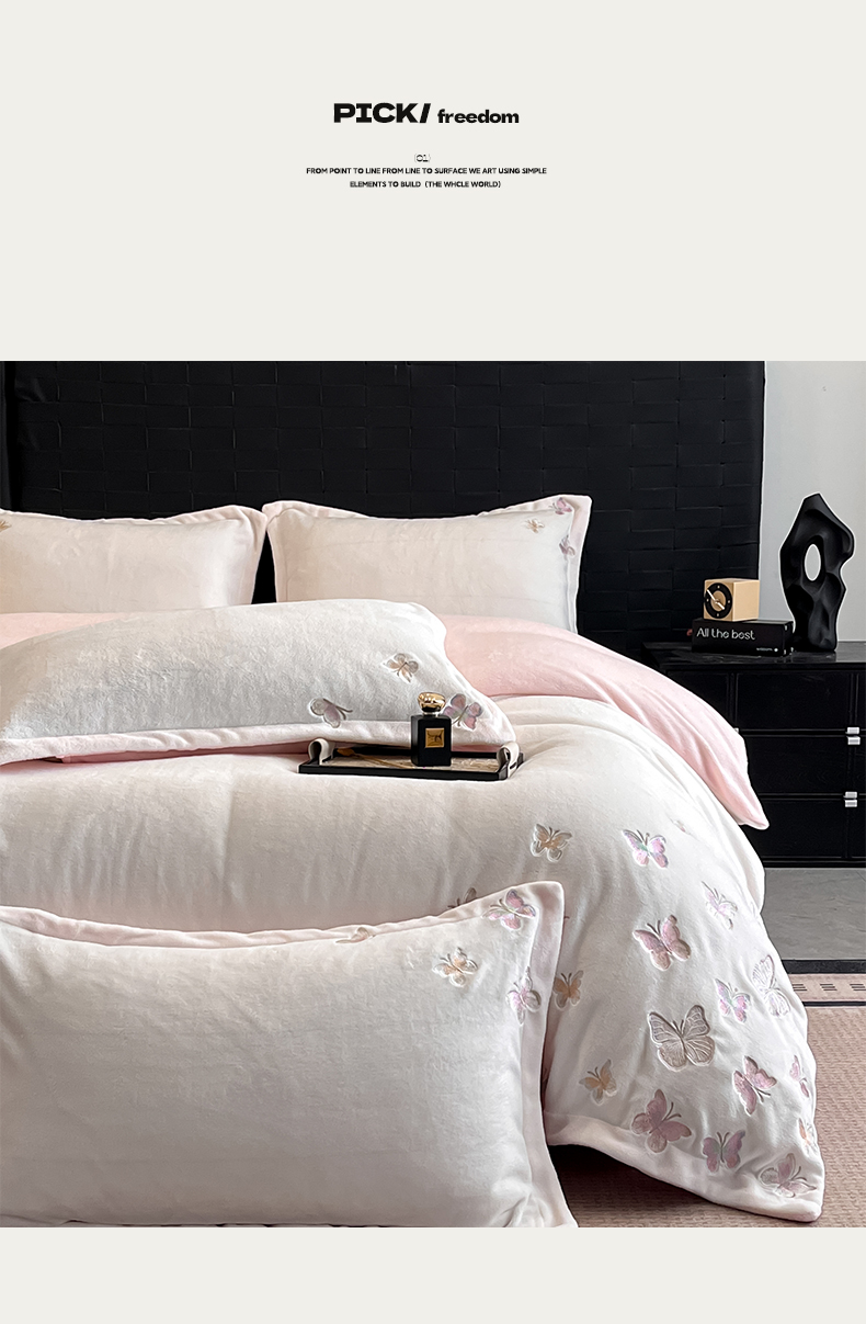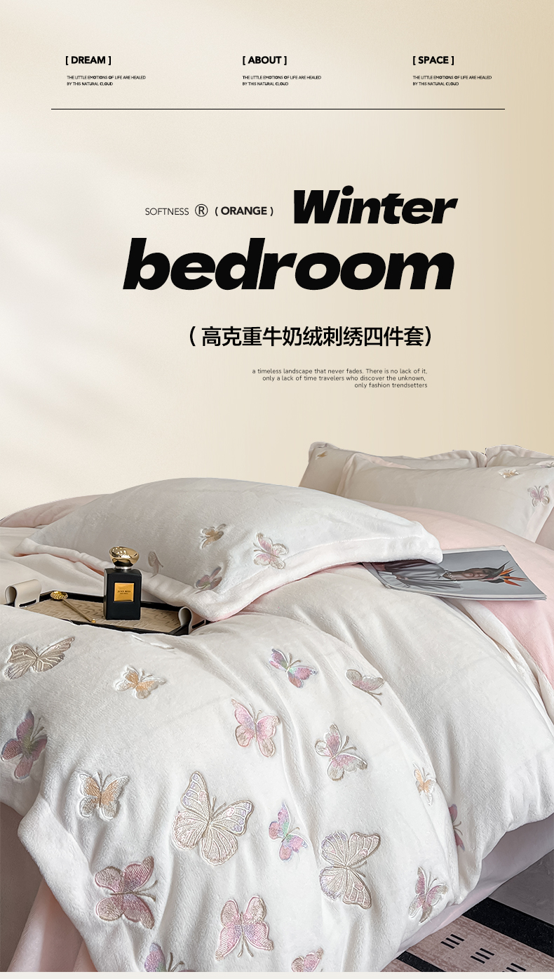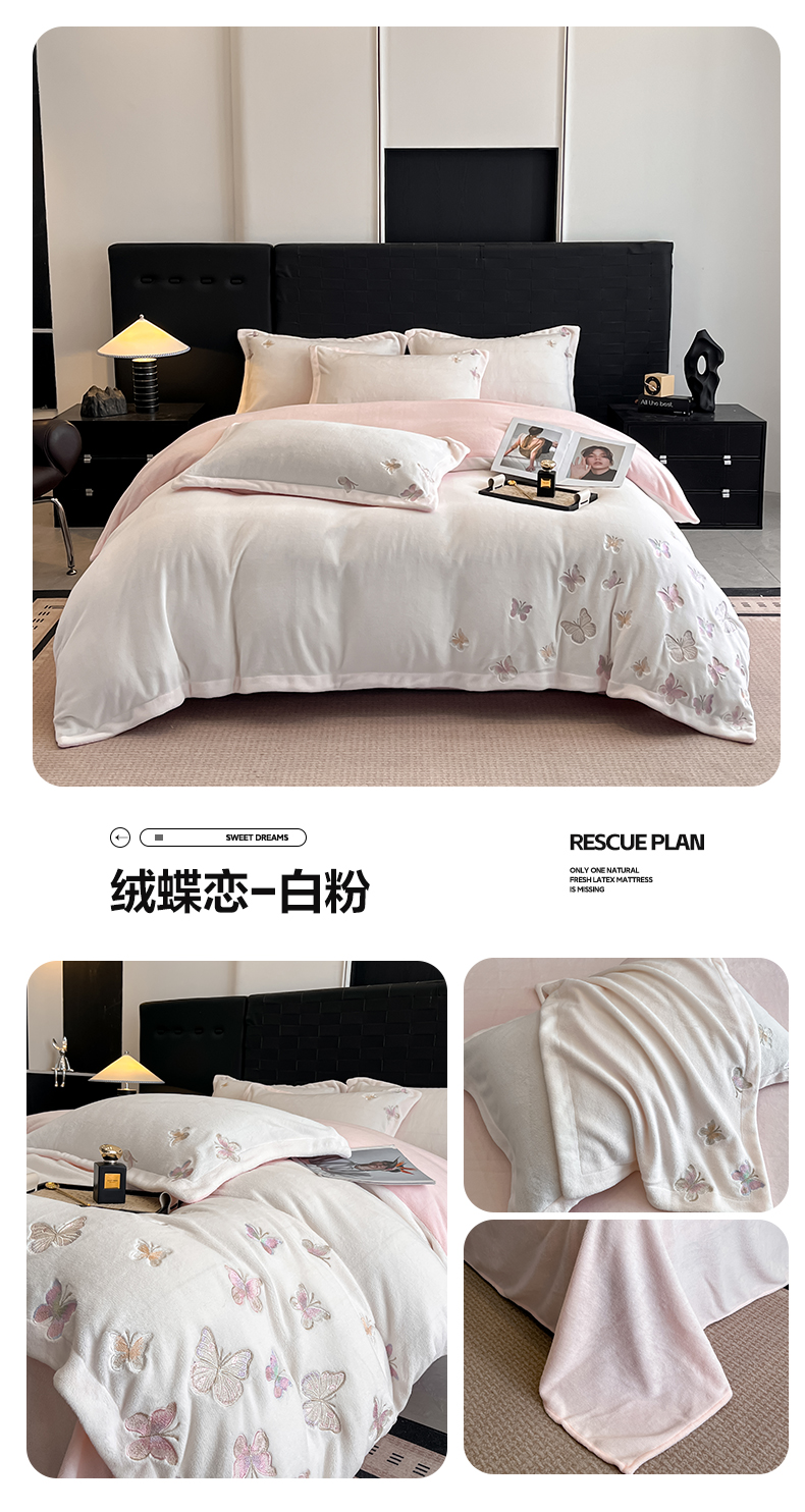逸尚阁 2025新款高克重牛奶绒刺绣四件套-绒蝶恋系列 绒蝶恋-白蓝