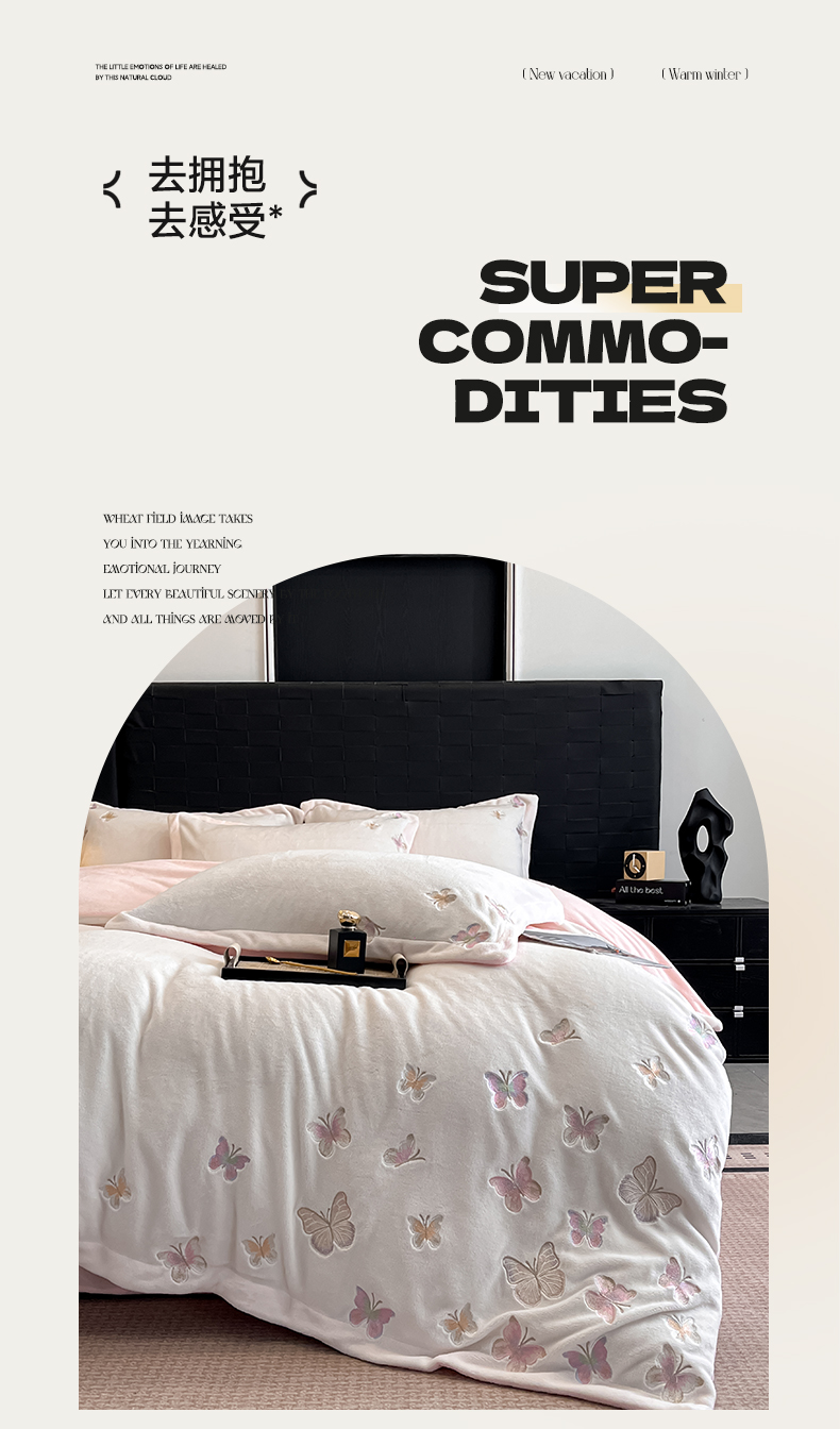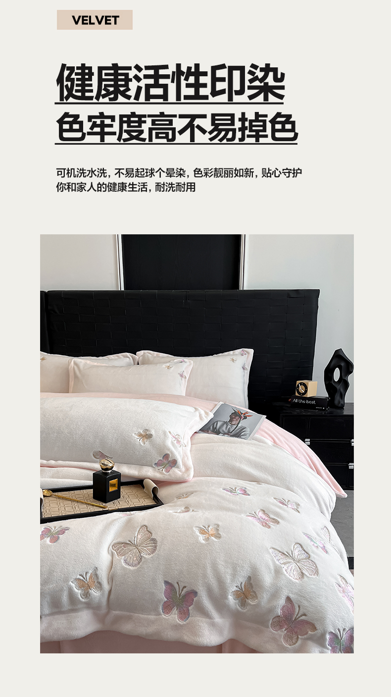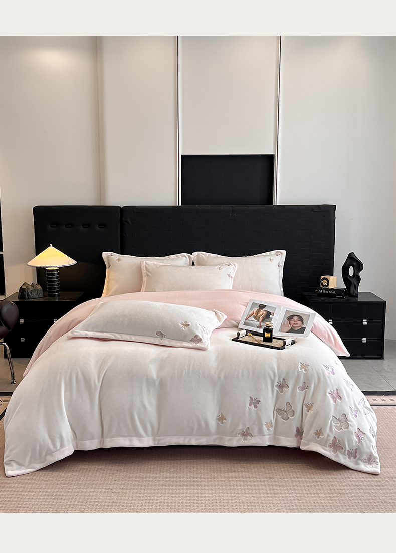 逸尚阁 2025新款高克重牛奶绒刺绣四件套-绒蝶恋系列 绒蝶恋-白蓝