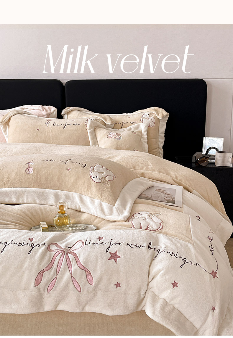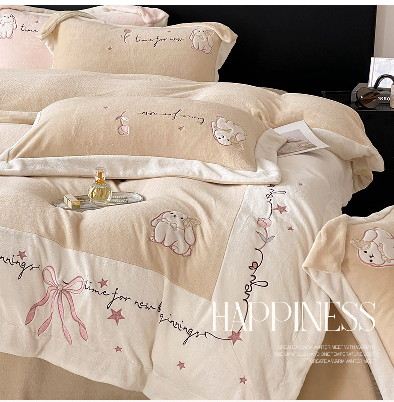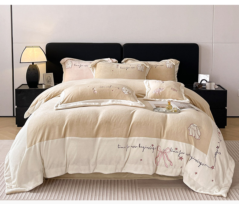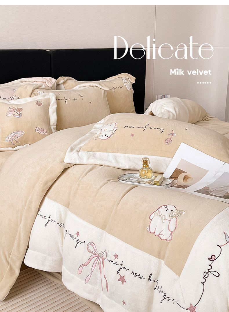 2025冬季爆款A类加厚牛奶绒四件套保暖双面加绒珊瑚绒重工刺绣被套床单卡通床上用品 萌兔-咖