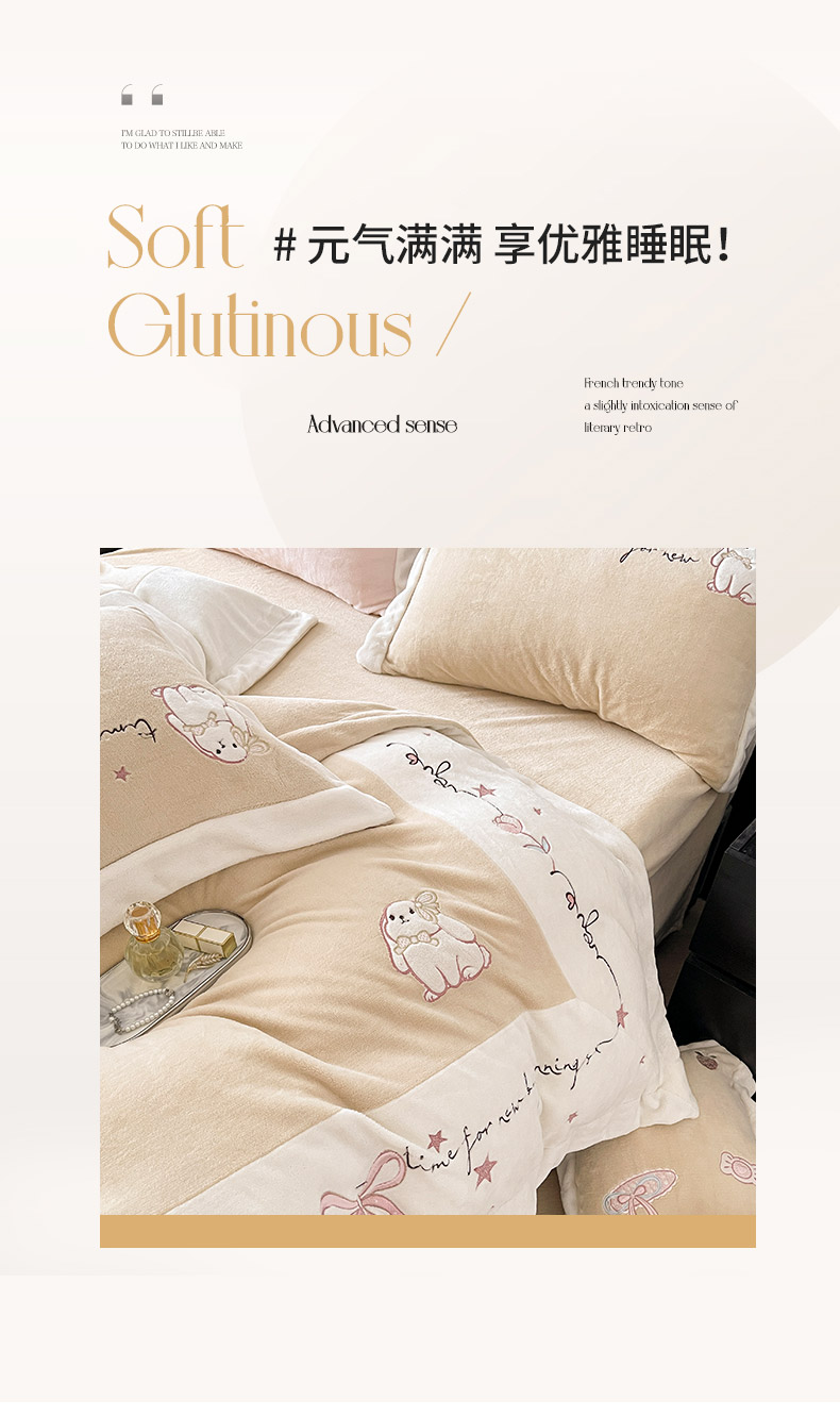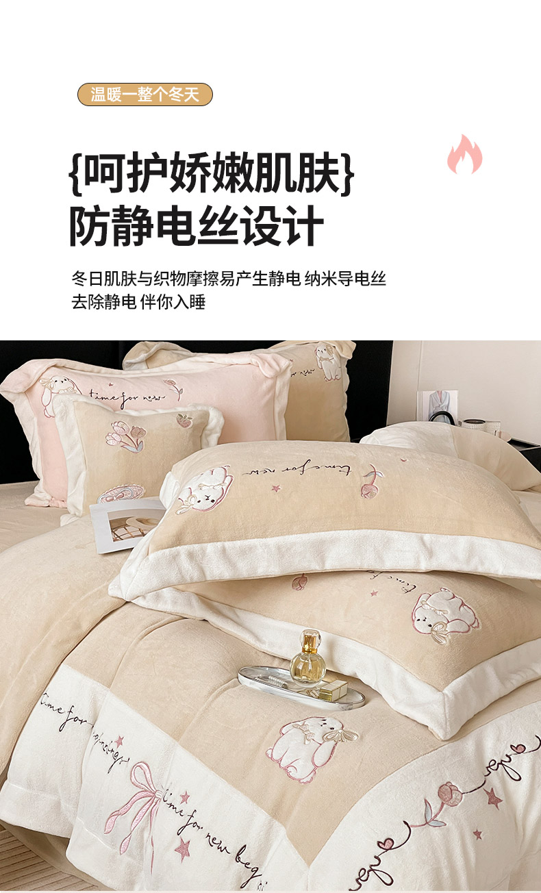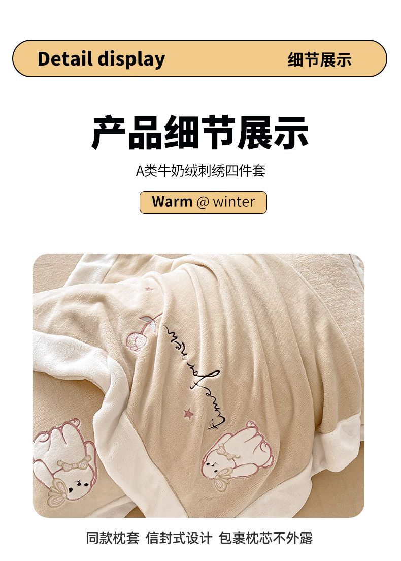 商品名称: 2025冬季爆款A类加厚牛奶绒四件套保暖双面加绒珊瑚绒重工刺绣被套床单卡通床上用品 萌兔-咖